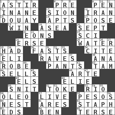 ACROSS 1. Moving or stirring 6. Before (prefix) 9. Fenced enclosure 12. Lacking in sense or substance 13. The Jewish people; Israel 14. SW Asia republic 15. A city in N France, SE of Calais 16. Tenement units (abbr.) 17. Airs 18. Acquire through effort 19. At sea 20. Back-to-school mo. 21. Immeasurably long periods of time 23. _-fi 24. Celtic language 25. Wetness 28. Possessed 30. Goes without food and/or water 34. Quote 35. Connecticut Ivy Leaguer 36. All-night dance parties 38. Santa ___, CA 39. Loose flowing garment 41. Leg coverings 43. Scottish cap 44. Makes a sale 46. Johnson of "Laugh-In" 48. Raised railways 49. Writer Wiesel 50. In a ____ (agitated or irritated) 51. Casino tip 53. River (Sp.) 56. Butter sub 57. Moving, as bait 58. Mexican monetary units 60. A home for chicks 61. Ancient Greek god of war 62. Staphylococcus 63. Begley and Asner 64. Benjamin's nick name 65. Laconic DOWN 1. Help 2. Overwhelm 3. "Change" in Tahitian 4. More empty; more void 5. Marina Del _, California 6. Corncob 7. Roll call or roster of names 8. Followers of ems 9. Conciliate 10. Compass direction 11. Compass dir. 13. Backtalk 14. Medicinal drug used to evoke vomiting 19. Approach 20. Compass dir. 22. Order of Saint Francis (abbr.) 24. The property of being fit to eat 26. Inactive volcano in Sicily 27. 480, 500 or 516 sheets of paper 28. Possessive pronoun 29. Medicinal plant 31. Plant excrement 32. Federal power corp. 33. Elected rep. 37. Having lost freshness 40. American author Paul (1891-1958) 42. _ Lanka 45. Fast jet (abbr.) 47. Cylindrical with tapered ends 49. Makes supply last 50. Downhill vehicle 51. Hoop that covers a wheel 52. Baking chamber 54. Austrian river, tributary to the Danube 55. I made a mistake 56. Single 57. Experiment locale 58. Pacific Standard Time (abbr.) 59. A female animal or person