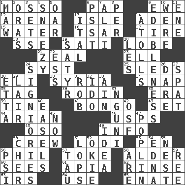 ACROSS 1. With motion or animation 6. Infant food 9. She-sheep 12. Sports stadium 13. Capri or Wright 14. Arabian gulf 15. Wetness 16. Russian ruler of old 17. Become fatigued 18. Compass dir. 19. Suttee (variant) 20. Ear part 21. Ardor 23. Pipe bend 24. System (abbr.) 25. Bobsleighs 28. Connecticut Ivy Leaguer 30. Damascus' land 34. Fastener 35. Label 36. "The Thinker" sculptor 38. Epoch 39. Prong on a fork 41. Beat drum 43. Arrange properly for use 44. Believer in; advocate of (suffix) 46. United States Postal Service (abbr.) 48. Bear (Spanish) 49. Information 50. Group working together 51. Farming town in central California 53. Fenced enclosure 56. Silvers or Donahue 57. Casino tip 58. Tree or shrub in the Birch family 60. Observes 61. Capital of Western Samoa 62. Remove soap 63. Big collection agency 64. Purpose 65. Related on the mother's side DOWN 1. Opening into something insatiable 2. Mouths or openings 3. Arranges properly for use 4. Dwarf with a sinus problem 5. Boat paddle 6. Inconspicuous attention getter 7. Jai _ 8. For each 9. The property of being fit to eat 10. Past tense of be (plural) 11. Compass dir. 13. Slanted text style (abbr.) 14. Ringlike coral islands and reefs 19. Man with strong sexual desires 20. French article 22. Double-curved letter 24. Seigniories (variant) 26. Have the gumption 27. Argument over a trivial matter 28. Singer James 29. Den 31. Director Reiner 32. Wedding promise 33. The 18th letter of the Arabic alphabet 37. Group of southern Bantu languages 40. Artist's stands 42. Order of Saint Francis (abbr.) 45. At this time 47. Cotton for raincoats, e.g. 49. It may be bright or harebrained 50. "Mermaids" star 51. Chops off 52. Migrant worker of the '30s 54. Pulitzer Prize-winning author Ferber 55. A home for chicks 56. Air pressure measure (abbr.) 57. The 19th letter of the Greek alphabet 58. "We ___ not amused" (Victoria) 59. To sift