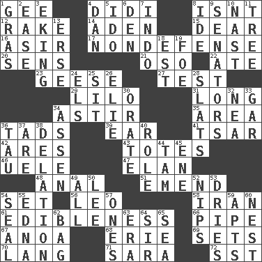 ACROSS 1. Unit of force equal to gravity 4. "You Light Up My Life" star Conn 8. Is not 12. Immoral or dissolute person 14. Arabian gulf 15. Letter starter 16. SW Saudi Arabia district 17. Unrelated to defense, as in spending 20. Elected reps. 21. Bear (Spanish) 22. Had dinner 23. Honkers 27. Trial 29. _ and Stitch 31. Protracted 34. Having gotten out of bed 35. Length times width 36. Small amounts or degrees 39. Ewer handle 41. Russian ruler of old 42. Ancient Greek god of war 43. Hauls 46. Ubangi River tributary 47. Enthusiasm 48. Of or related to the anus 51. Make improvements or corrections to 54. Put into a specified state 56. Lion 58. SW Asia republic 61. The property of being fit to eat 66. Corncob 67. Small Philippine buffalo 68. One of the Great Lakes 69. Puts into a specified state 70. Long (Scottish) 71. "Two Mules for Sister ____" 72. Fast jet (abbr.) DOWN 1. Pate de foie ____ 2. Relaxation 3. Supplementing with great effort 4. Daniel's nick name 5. Wedding promise 6. Lair 7. Southeast Asian peninsula 8. Binary compound 9. Legislators 10. Political cartoonist Thomas 11. Woody plant 13. Celtic language 18. Eastern Standard Time (abbr.) 19. Enemy 24. Raised railways 25. Be seated 26. Writer Wiesel 28. Narrow boards 30. Speak pompously 32. Teachers' org. 33. Slender fish 34. NE Netherlands city 36. The 19th letter of the Greek alphabet 37. "We ___ not amused" (Victoria) 38. Conveyance 40. Hero or heavy, e.g. 44. Scottish cap 45. Compass dir. 49. 100% 50. Area sheltered from the wind 52. Cuts off 53. Frees from moisture 54. Lick closed 55. Pulitzer Prize-winning author Ferber 57. Singles 59. Flats, for short 60. Egg locale 62. Paper or plastic container 63. Epoch 64. Title for a knight 65. Ocean