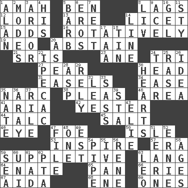 ACROSS 1. Housemaid 5. Benjamin's nick name 8. Fails to keep up a pace 12. Australian parrot (variant) 13. "We ___ not amused" (Victoria) 14. It is permitted: Lat. 15. Sums up 16. Rotating or pertaining to rotation 19. Modern: prefix 20. Choose not to consume 21. Indian titles of respect 23. A saturated hydrocarbon 24. Three (prefix) 27. Lightbulb-shaped fruit 30. Froth on beer 31. Artist's stands 34. Comfort 35. Drug cop 38. Entreaties 40. Type of rug 41. Operatic vocal solo 42. Last past 44. Baby powder 45. Table seasoning 46. Sight organ 47. Enemy 50. Capri or Wright 53. Motivate 57. Epoch 59. Supplementary 63. Long (Scottish) 64. Related on the mother's side 65. Baking dish 66. One of the Great Lakes 67. Opera by Verdi 68. Compass dir. 69. Singles DOWN 1. Actor Alda or Thicke 2. Methods 3. Zeal 4. Part of HMS, perhaps 5. Sharp remark 6. Greek god of love 7. Remaining after all deductions 8. 54 in ancient Rome 9. Adept person 10. Set 11. Filthy place 14. Actor's bit 17. American Automobile Association (abbr.) 18. Metal container 20. Toward the sea 22. Medicinal drug used to evoke vomiting 24. Pull apart 25. Raze (variant) 26. The main thing one is thinking about 28. Viper 29. Have trust in 30. Centers 32. Area sheltered from the wind 33. Backtalk 35. Nathan's nickname 36. Like ___ of sunshine 37. Cause heat under the collar 39. R.R. building 43. Writer Wiesel 47. Do some clerical work 48. Single 49. Eastern Standard Time (abbr.) 51. Memorize 52. Bert's buddy 54. Corncob 55. _ the terrible 56. French philosopher Descartes 58. Grows older 59. Ocean 60. University (slang) 61. Writing tablet 62. Parent Teacher Association (abbr.) 63. Lion