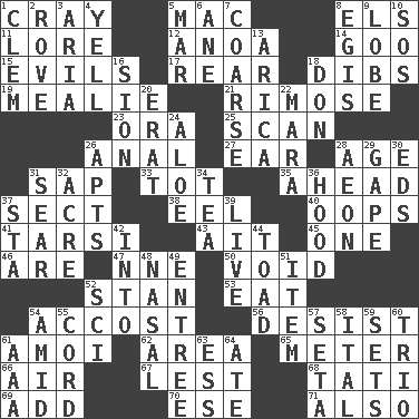 ACROSS 1. Supercomputer manufacturer 5. Apple computer (short form) 8. Raised railways 11. Old wives' tales, e.g. 12. Small Philippine buffalo 14. Thick or sticky substance 15. Vices 17. Hitchcock's "____ Window" 18. Claim 19. Ear of corn 21. Full of chinks, cracks, or crevices 23. Mouth or opening 25. Skim 26. Of or related to the anus 27. Hearing organ 28. Grow older 31. Plant excrement 33. Small child 35. Having the leading position 37. Religious group 38. Snakelike fish 40. I made a mistake 41. Tarsus (plural) 43. Small island 45. Single 46. "We ___ not amused" (Victoria) 47. Compass dir. 50. State of nonexistence 52. Comedian Laurel of Laurel & Hardy 53. Erode 54. Buttonhole 56. Stop 61. Mine, in Marseilles 62. Type of rug 65. Distance measurement 66. Wind 67. For fear that 68. Jacques of French films 69. Say or write further 70. Compass dir. 71. In addition DOWN 1. To starve (Brit.) 2. Be footloose 3. Roberta Peters solo 4. Shout 5. Impair 6. One (Scot) 7. Rough 8. The front part of a cuirass 9. Ear part 10. Mayday 13. N. Chile seaport 16. The Jewish people; Israel 18. Spanish title 20. Part of Q.E.F. 22. Hindu Mythology: god of death 24. _ vera 26. Flats, for short 28. Period of immesurable duration 29. Stare wonderingly 30. Begley and Asner 31. Wither 32. 43,560 square feet 34. Beverage made from leaves 36. Parka part 37. R.R. building 39. Moving, as bait 42. To the inside or interior of 44. Frog relative 48. Rhinal 49. Main course 51. A distinct part 52. _-fi 54. Among 55. Drawstring 57. Stalk of a moss capsule 58. Slanted text style (abbr.) 59. Arranges properly for use 60. Musical group of three 61. Auto club (abbr.) 63. Curvy letter 64. Had dinner