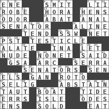 ACROSS 1. Compass dir. 4. Stricken, poetically 8. Cards in a Roman deck? 11. Loose flowing garment 13. Israeli folk dance 14. Coop moms 15. Aroma 16. Blind as ____ 17. Of or related to the anus 18. Legislator 21. Place in a line 22. Look after 23. Compass dir. 25. Fish or hair follower 26. Pacific Standard Time (abbr.) 29. One of the two male reproductive glands 32. Having winglike extensions 34. _ tizzy (2 wds.) 35. Allow 38. Unadorned 39. Music written for nine 41. Stated 43. Girls' org. (abbr.) 44. Curve 45. Father Junipero _ 46. Legislators 50. Elected rep. 51. Raised railways 54. Separate the seeds from cotton 55. Printing process, for short 57. Former Milwaukee Brewers owner Bud 59. Refrain by choice 63. Drawn tight 64. Water vessel 67. Periodic rise and fall of the sea level 68. Blunders 69. Small island 70. Lyric poems 71. Followers of ems 72. Disposed of to a purchaser 73. Ingest DOWN 1. Greek god of love 2. Connecting point 3. Inky black, to poets 4. Pottery fragments 5. Disorderly crowd 6. Lyricist Gershwin 7. Make lace 8. Soviet premier 1918-24 9. Lacking in sense or substance 10. Small island 12. Part of Q.E.F. 14. Actor Linden 19. False hair 20. Single 21. Leather borer 23. Trig term 24. Scram, to a cat 26. Baking dish 27. Strike heavily 28. Small amounts or degrees 30. Colored lightly or faintly 31. Otherwise 33. Beverages made from leaves 36. Hearing organs 37. Hoop that covers a wheel 39. Grandmother 40. Northwest Algerian city 42. One of the 12 tribes of Israel 45. Fast planes 47. Oval reproductive body of a fowl 48. Declaimed 49. Director Reiner 51. First name in cosmetics 52. Memorize 53. Plays smoothly or legato 56. "Beetle Bailey" pooch 58. ___ a Wonderful Life 60. Assistant 61. It may be bright or harebrained 62. A home for chicks 64. Altar cloth linen 65. Bear (Spanish) 66. Everything