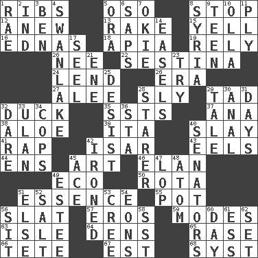 ACROSS 1. Chest bones 5. Bear (Spanish) 8. Cease 12. Afresh 13. Immoral or dissolute person 15. Shout 16. Ferber et al. 18. Capital of Western Samoa 19. Have confidence or faith in 20. Born 22. French poetic form 24. Grant temporary use of 26. Period 27. Toward shelter 28. Mischievous 29. Small amount or degree 32. Evade 35. Fast planes 37. Santa ___, CA 38. Medicinal plant 39. Call ___ day 40. Kill 41. Reproach for some lapse or misdeed 42. Austrian river, tributary to the Danube 43. Snakelike fish 44. Followers of ems 45. Tate display 46. Flair 49. Environmental prefix 50. Round or rotation of duties 51. Core 55. Cooking vessel 56. Narrow board 57. Greek god of love 59. Methods 63. Capri or Wright 64. Lairs 65. Raze (variant) 66. Wig 67. Eastern Standard Time (abbr.) 68. System (abbr.) DOWN 1. Actress Charlotte 2. Indiana (abbr.) 3. Benjamin's nick name 4. Tchaikovsky ballet 5. Mouth or opening 6. Plant excrements 7. Migrant worker of the '30s 8. Damascus' land 9. Adolescent 10. Rounded earthenware pot or jar 11. Apply oneself diligently 14. Artist's stands 17. Stitch closed the eyes of (a falcon) 21. Compass dir. 23. Attempt to accomplish something 25. Stop 28. A viewer who gazes fixedly 29. Story 30. Of or related to the anus 31. 24-hour periods 32. Have the gumption 33. ____ Bator 34. 911 reaches them 36. R.R. building 40. Elected representatives 42. Pressed 45. Adept person 47. Trim (branches) 48. Smallest unit of an element 49. First name in cosmetics 51. Otherwise 52. Table seasoning 53. Algonquian 54. Immeasurably long periods of time 56. Be seated 58. Fast jet (abbr.) 60. 24 hours 61. Double-curved letter 62. Arrange properly for use