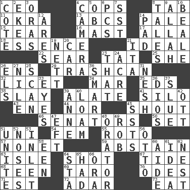 ACROSS 1. Corporate head (abbr.) 4. 911 reaches them 8. Bar bill 11. Gumbo ingredient 13. Lettered men learn these first 14. Light colored 15. Rend 16. Vertical spar for supporting sails 17. Silent film actress Nazimova 18. Substance 21. Perfect 22. Shrivel 23. Make lace 25. A female animal or person 26. Followers of ems 29. File 13 32. It is permitted: Lat. 34. Third mo. 35. Begley and Asner 38. Kill 39. Having winglike extensions 41. Grain storage tower 43. Compass dir. 44. And not 45. Yell 46. Legislators 50. Put into a specified state 51. Single; one (prefix) 54. Opposite of masc. 55. Printing process, for short 57. Music written for nine 59. Refrain by choice 63. Capri or Wright 64. Guess 67. Periodic rise and fall of the sea level 68. Adolescent 69. Edible starchy tuberous root 70. Lyric poems 71. Eastern Standard Time (abbr.) 72. The sixth month of the Jewish calendar 73. Erode DOWN 1. ____ d'Azur (French Riviera) 2. Supplements with great effort 3. Mouths or openings 4. Device for capturing images 5. Chief or king in Benin or Nigeria 6. Personal Computers (abbr.) 7. Fast jet (abbr.) 8. Stories 9. Assad's deity 10. Calif. Air Force Base 12. Ancient Greek god of war 14. Groovy apt. 19. Remaining after all deductions 20. 4-wheeled motor vehicle 21. Call ___ day 23. Not this but _ 24. Measure of real estate 26. Raised railways 27. Mediterranean tributary 28. Examine hastily 30. Don Adams' spy role 31. Soft 33. Sight organs 36. "Vaya con ____" 37. Turn sharply 39. Queen of England 1702-14 40. Rich soil 42. Baseball player Mel 45. Fast planes 47. Lizard (obsolete) 48. Speaker 49. Director Reiner 51. Join together 52. Olfactory organs 53. An arm off of a larger body of water 56. Von Bismarck 58. Car or cant ending 60. Helper 61. The content of cognition 62. Egg locale 64. R.R. building 65. Possessed 66. Mouth or opening