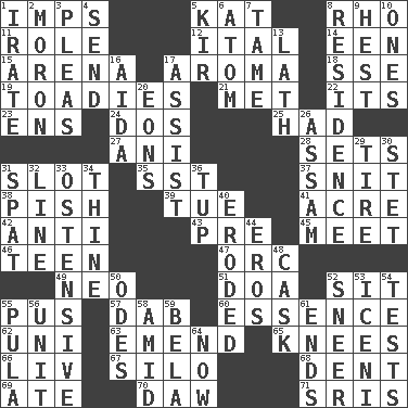ACROSS 1. Naughty children 5. Krazy ___ of comics 8. 17th letter of the Greek alphabet 11. Hero or heavy, e.g. 12. Slanted text style (abbr.) 14. Car or cant ending 15. Sports stadium 17. Odor 18. Compass dir. 19. Sycophants 21. Was introduced to 22. ___ a Wonderful Life 23. Followers of ems 24. Two (Sp.) 25. Possessed 27. Cuckoo 28. Arranges properly for use 31. Position in a hierarchy or organization 35. Fast jet (abbr.) 37. In a ____ (agitated or irritated) 38. Expression of disdain 39. Third day of the wk. 41. Land measure 42. Against 43. Before (prefix) 45. Rendezvous 46. Adolescent 47. The grampus (Milton) 49. Modern: prefix 51. ___ good deed 52. Be seated 55. Fluid product of inflammation 57. Apply (a substance) by light strokes 60. Center 62. Single; one (prefix) 63. Make improvements or corrections to 65. Leg joints 66. 54 in ancient Rome 67. Grain storage tower 68. Scratch 69. Had dinner 70. Fool 71. Indian titles of respect DOWN 1. Feeling or showing extreme anger 2. Person of subnormal intelligence 3. Entreaties 4. Post 5. Apertif with cassis 6. Tiny particle 7. Not wild 8. Dwelling 9. Behest 10. Washington bills 13. Thin strip of wood or metal 16. Opera by Verdi 17. Help 20. Immeasurably long periods of time 26. Indian state 29. Hoop that covers a wheel 30. Proofreading order 31. Petty quarrel 32. Actor's bit 33. Clearly or manifestly demonstrative 34. One or ones belonging to thee 36. Uncastrated adult male sheep 40. Worn away 44. Greek god of love 48. Keg 50. Lyric poems 52. Scornful expression 53. Ancient Celtic tribe of eastern Britain 54. Trials 55. Monetary unit of Botswana 56. A single undivided whole 58. Among 59. Actor Lugosi 61. Conclusions 64. At this time