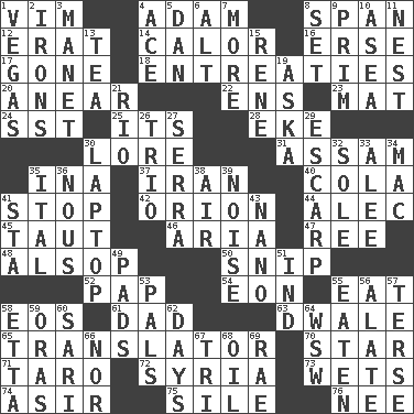 ACROSS 1. Zeal 4. First man 8. Connect, as a bridge 12. Part of Q.E.F. 14. Bodily heat indicating an inflammation 16. Celtic language 17. Went 18. Pleas 20. Approach 22. Followers of ems 23. Floor protector 24. Fast jet (abbr.) 25. ___ a Wonderful Life 28. Make supply last 30. Old wives' tales, e.g. 31. Indian state 35. _ tizzy (2 wds.) 37. SW Asia republic 40. Root beer relative 41. Obstruct or block passage 42. Constellation of myth 44. Actor Baldwin 45. Pulled tight 46. Operatic vocal solo 47. To separate or throw off 48. Columnist Joseph or Stewart 50. Clip 52. Infant food 54. Age 55. Erode 58. Greek goddess of the dawn 61. Male parent 63. A sleeping potion; an opiate (poet.) 65. Interpreter 70. Play the lead 71. Edible starchy tuberous root 72. Damascus' land 73. Soaks 74. SW Saudi Arabia district 75. Drop; flow; fall 76. Born DOWN 1. Viva Las _ 2. Metal shackles 3. French painter Edouard 4. Adept person 5. One of the 12 tribes of Israel 6. Keyboard modifier key 7. Greater amount 8. Put into a specified state 9. Demure 10. At sea 11. A home for chicks 13. Afternoon social gathering 15. French philosopher Descartes 19. "____ silly question..." 21. River (Sp.) 26. Musical group of three 27. Spanish missionary in California 29. Fortification 30. Portable computer 32. Flatfish 33. Toward shelter 34. Big _ 35. Slanted text style (abbr.) 36. Common sense 38. Atmosphere 39. Annoying sound 41. R.R. building 43. Billionth: prefix 49. Writing tablets 51. Working for oneself (abbr.) 53. Friends 55. Ingested 56. Having winglike extensions 57. Laconic 58. Singer James 59. Mouths or openings 60. Indian skirt 62. 24-hour periods 64. Compass dir. 66. And not 67. Three (prefix) 68. Lubricate 69. Actress Charlotte