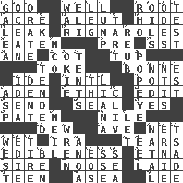 ACROSS 1. Thick or sticky substance 4. Not ill 8. Carrot, for example 12. 1/640 square mile 14. Native American of Southwest Alaska 16. Flintstone garb 17. Path through which fluid escapes 18. Complicated, petty procedures 20. Ingested 22. Before (prefix) 23. Fast jet (abbr.) 24. A saturated hydrocarbon 25. Small bed 28. Uncastrated adult male sheep 30. Puff or smoke 31. Child's nurse 35. Binary compound 37. International (abbr.) 40. Cooking vessels 41. Arabian gulf 42. Value system 44. Prepare for publication 45. Transmit 46. Lick closed 47. Consenting reply 48. Eucharist need 50. The longest river in the world 52. Morning condensation 54. "___ Maria" 55. Fish or hair follower 58. Dripping 61. Retirement account (abbr.) 63. Rends 65. The property of being fit to eat 70. Inactive volcano in Sicily 71. Beget 72. Trap for birds or small mammals 73. Put down 74. Adolescent 75. At sea 76. Area sheltered from the wind DOWN 1. An organ shaped like a helmet 2. Sea 3. Declaim 4. Armed conflict 5. Connecticut Ivy Leaguer 6. Part of a journey 7. Mass 8. 17th letter of the Greek alphabet 9. Lubricates 10. Lyric poems 11. Trial 13. Supplement with great effort 15. Small pie 19. Reuben's nickname 21. Non-commissioned officer (abbr.) 26. Migrant worker of the '30s 27. Portable shelters 29. Wimpy's pal 30. Watched over 32. Thickened enlargement 33. Nuclear Threat Initiatives 34. Eastern Standard Time (abbr.) 35. The main thing one is thinking about 36. Incision 38. Definite Article 39. Climbing, woody, usually tropical vines 41. Viper 43. 154 in Roman numerals 49. Famous astronaut Armstrong 51. Allow 53. Songbird 55. Brizilian seaport 56. Bert's buddy 57. Sadhe (variant) 58. Compass direction 59. Singer Brickell 60. Hoop that covers a wheel 62. Small Philippine buffalo 64. Snakelike fish 66. Benjamin's nick name 67. Greek goddess of the dawn 68. Compass dir. 69. Ocean