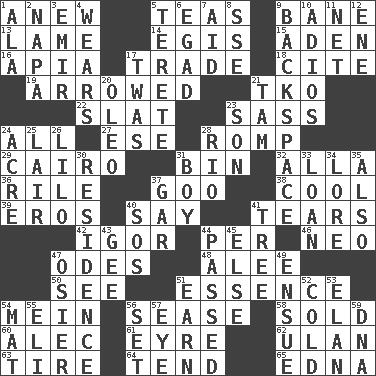ACROSS 1. Afresh 5. Afternoon social gatherings 9. Object of repulsion 13. Unable to walk 14. The front part of a cuirass 15. Arabian gulf 16. Capital of Western Samoa 17. Barter 18. Quote 19. Moved like an arrow 21. Ring climax 22. Narrow board 23. Backtalk 24. Everything 27. Compass dir. 28. Play 29. Capital of Egypt 31. Storage container 32. Silent film actress Nazimova 36. Cause heat under the collar 37. Thick or sticky substance 38. Calm and collected 39. Greek god of love 40. Declare 41. Pulls apart 42. Composer Stravinsky 44. For each 46. Modern: prefix 47. Lyric poems 48. Toward shelter 50. Observe 51. Substance 54. Count _ (2 wds.) 56. Gospel singer Marvin 58. Disposed of to a purchaser 60. Actor Baldwin 61. Jane of fiction 62. ____ Bator 63. Hoop that covers a wheel 64. Be inclined (to) 65. Pulitzer Prize-winning author Ferber DOWN 1. In the manner of 2. California wine valley 3. Independent ruler or chieftain 4. Erodes 5. Cigar-shaped 6. Mild oath 7. Assist 8. Compass dir. 9. Keyboard key 10. Goodbye (Sp.) 11. Fish or hair follower 12. Compass dir. 17. It was, poetically 20. Butter sub 21. Scottish cap 23. Manchild 24. 1/640 square mile 25. Den 26. _ and Stitch 28. _ de Janeiro 30. Home 31. Male child 33. Grant temporary use of 34. Old wives' tales, e.g. 35. In addition 37. Slender fish 40. Mayday 41. Woody plant 43. Turn to the right 44. Went by 45. Otherwise 47. Flexible twig of a willow tree 49. Follow as a consequence or result 51. Merit 52. Lacking warmth 53. Enthusiasm 54. Floor covering 55. Connecticut Ivy Leaguer 56. Put into a specified state 57. Sight organ 59. Heredity factor (abbr.)