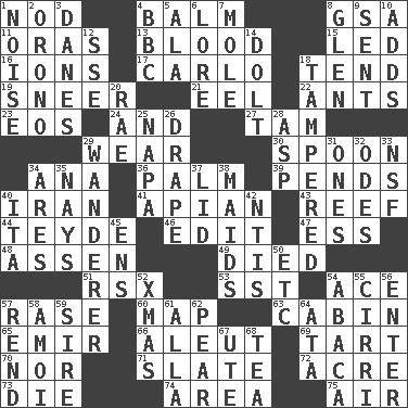 ACROSS 1. Lower and raise head in agreement 4. Lip ointment 8. Girls' org. (abbr.) 11. Mouths or openings 13. Vital fluid 15. Directed 16. Charged particles 17. Monte _, Las Vegas Hotel/Casino 18. Look after 19. Scornful expression 21. Snakelike fish 22. Pismires 23. Greek goddess of the dawn 24. Added to 27. Scottish cap 29. Erode 30. Soup utensil 34. Santa ___, CA 36. Inside of hand 39. Depends 40. SW Asia republic 41. Bee-related 43. Coral ridge 44. Miss Universe 1986, Barbara Palacios _ 46. Prepare for publication 47. Curvy letter 48. NE Netherlands city 49. Passed on 51. Acura sports coupe 53. Fast jet (abbr.) 54. Adept person 57. To erase 60. Atlas unit 63. Small house or cottage 65. Independent ruler or chieftain 66. Native American of Southwest Alaska 69. Small pie 70. And not 71. Schedule 72. Land measure 73. Expire 74. Type of rug 75. Atmosphere DOWN 1. Annoying sound 2. U. of Maine site 3. Natives or inhabitants of Denmark 4. English channel? 5. Wing 6. Old wives' tales, e.g. 7. Undercover agent 8. Small, secluded valley 9. Posted 10. Sums up 12. Compass dir. 14. Dunce 18. ________ with (broke a safety seal) 20. Actress Charlotte 25. California wine valley 26. Window treatment 28. Viper 29. Roamer 31. Singles 32. Lyric poems 33. Science/research agcy. 34. Ancient Greek god of war 35. Negative votes 37. Flaplike covering 38. Women servants 40. Call ___ day 42. Nuclear Threat Initiatives 45. Followers of ems 50. And so on (abbr.) 52. Dec. holiday 54. Phillipine bananalike plant 55. High-altitude cloud 56. Keyboard key 57. Tear apart 58. Mine, in Marseilles 59. Title for a man of rank and authority 61. Silent film actress Nazimova 62. Lightbulb-shaped fruit 64. _ moment's notice (2 wds.) 67. Shoshoni 68. Afternoon social gathering
