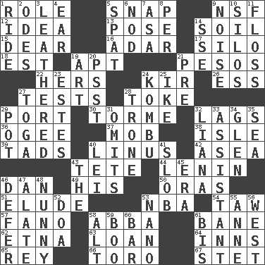 ACROSS 1. Hero or heavy, e.g. 5. Fastener 9. Science/research agcy. 12. The main thing one is thinking about 13. Introduce or present, as a question 14. Earth 15. Letter starter 16. The sixth month of the Jewish calendar 17. Grain storage tower 18. Eastern Standard Time (abbr.) 19. Fitting 21. Mexican monetary units 22. Possessive pronoun 24. Apertif with cassis 26. Curvy letter 27. Trials 28. Puff or smoke 29. Sweet dark-red dessert wine 30. Singer Mel 32. Falls behind 36. Double curve, resembling the letter S 37. Crowd into 38. Capri or Wright 39. Small boys 40. "_ and Lucy" (Charlie Brown theme song) 42. At sea 43. Wig 44. Soviet premier 1918-24 46. Daniel's nick name 49. Part of HMS, perhaps 50. Mouths or openings 51. Evade 53. Basketball assoc. 54. The 23rd letter of the Hebrew alphabet 57. Papal veil 58. Swedish rock group 61. Object of repulsion 62. Inactive volcano in Sicily 63. Grant temporary use of 64. Restaurants 65. Marina Del _, California 66. "Corrida" creature 67. Proofreading order DOWN 1. Travel on or in a vehicle 2. Lyric poems 3. Resembling or made to resemble leather 4. Hearing organ 5. Petty quarrel 6. Dreamland 7. White ___ sheet 8. For each 9. Annoying sound 10. Grain storage towers 11. Soft thread for cleaning between teeth 14. Compass dir. 19. Tate display 20. Inconspicuous attention getter 21. Before (prefix) 23. _____ Park, CO 24. Dried seaweed eaten as food 25. Mamie's husband 27. Ancient Roman robe 28. Heavy duty weighing machine 29. Cooking vessel 31. Leaves out 32. Climbing, woody, usually tropical vines 33. Helper 34. Small, secluded valley 35. Ocean 40. Flowery wreath 41. Messy guy 43. Definite Article 45. Period 46. Put off 47. Having winglike extensions 48. Pet term 52. ___ good deed 53. Billionth: prefix 55. Queen of England 1702-14 56. 270 degrees 58. Keyboard modifier key 59. Sometimes accompanies a hiss 60. Oblong piece of solid material 61. Twice