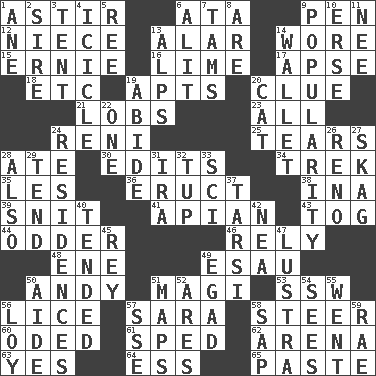 ACROSS 1. Moving about 6. _ moment's notice (2 wds.) 9. Fenced enclosure 12. Sibling's daughter 13. Having or resembling wings 14. Had on 15. Bert's buddy 16. Welles in "The Third Man" 17. Domed church section 18. And so on (abbr.) 19. Flats, for short 20. A slight indication 21. Tennis shots 23. 100% 24. Painter Guido (1575-1642) 25. Pulls apart 28. Had dinner 30. Proofreads 34. Long journey 35. French article 36. Spew [out] 38. _ tizzy (2 wds.) 39. In a ____ (agitated or irritated) 41. Bee-related 43. Coat; cloak 44. More peculiar 46. Have trust in 48. Compass dir. 49. Son of Isaac 50. Actor Griffith 51. Wise men 53. Compass dir. 56. Louse (plural) 57. "Two Mules for Sister ____" 58. Guide 60. Wrote a lyric poem 61. Hurried 62. Sports stadium 63. It is so 64. Curvy letter 65. Thick mixture DOWN 1. One (Scot) 2. Title for a man of rank and authority 3. Portable shelter 4. Hanging ice 5. To separate or throw off 6. Came down and settled, as after flight 7. Scottish caps 8. "We ___ not amused" (Victoria) 9. Teen's desire 10. Celtic language 11. Born 13. High mountains 14. Place for singles 19. Remain 20. Domesticated feline 22. Single 24. Dwellings 26. Former U.S. Attorney General Janet 27. Heroin 28. In addition 29. Watch over 31. Lyricist Gershwin 32. Uncastrated adult male sheep 33. _-fi 37. Tarsus (plural) 40. Watched over 42. Teachers' org. 45. Marina Del _, California 47. A period of five years 49. Mild oath 50. Assistant 51. Atlas contents 52. Ancient Greek god of war 54. Perceives with the eye 55. Gone 56. Myrna of the movies 57. Compass dir. 58. Plant excrement 59. Actress Charlotte