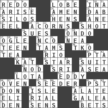 ACROSS 1. Redecorate 5. Ear part 9. _ tizzy (2 wds.) 12. Originate 14. So be it 15. Small moist lump or mass 16. Grain storage towers 17. Coop moms 18. A saturated hydrocarbon 19. Snakelike fish 20. Oak nuts 23. Attempt 24. Takes to court 25. Southwest Nigerian state 27. Stare at amorously 30. Non-commissioned officer (abbr.) 32. Teachers' org. 33. Adolescent 34. Scottish caps 36. Ring climax 38. Beverage made from leaves 39. River (Sp.) 40. Parent Teacher Association (abbr.) 43. Krazy ___ of comics 46. Play the lead 48. Set or collection 49. Lower and raise head in agreement 51. Indian title of respect (Mr.) 52. Toward the sea 53. Globular water bottle used in Asia 54. Whirlpool 56. Baking chamber 58. Sowing specialist 61. Pacific Standard Time (abbr.) 64. Spanish title 65. Capri or Wright 66. Having winglike extensions 68. Biblical high priest 69. Monetary unit of Yemen 70. An organ shaped like a helmet 71. Lair 72. Elected reps. 73. Stakes DOWN 1. Raze (variant) 2. 4th largest of the Great Lakes 3. Deli pickle 4. Bear (Spanish) 5. Cowardly lion portrayer 6. Sign of something about to happen 7. Gillaume's butler role 8. Followers of ems 9. Potato state 10. Billionth: prefix 11. Collude with 13. Son of Isaac 21. Penny 22. Motion picture awards 23. Neighbor of Neb. 24. Elected rep. 26. Fish or hair follower 27. Baseball player Mel 28. Unit of force equal to gravity 29. Path through which fluid escapes 31. Leaves out 35. Flew 37. Musical composition 41. Make a knot 42. _ moment's notice (2 wds.) 44. Soon (poet.) 45. Small child 47. Travel on an animal 48. Declare 50. Small ungulate mammals of Africa 53. Soviet premier 1918-24 55. To draw with force 56. Wrote a lyric poem 57. Grand slam 59. Flair 60. Snakelike fish 61. Light colored 62. Proofreading order 63. Beverages made from leaves 65. Big collection agency 67. Experiment locale