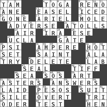 ACROSS 1. Scottish cap 4. Ancient Roman robe 8. Former U.S. Attorney General Janet 12. A saturated hydrocarbon 13. Artist's stand 14. On the rocks 15. Went 17. Satellite of Uranus 18. Undercover agent 19. Contrary to your interests or welfare 21. Ringlike coral islands and reefs 23. Wind 24. Retirement account (abbr.) 26. Compass dir. 27. Southern CA. univ. 28. Yard entry 30. Air pressure measure (abbr.) 31. Electrical Unit 34. Being at a high temperature 37. Put into a specified state 38. Inhabitant of Heaven 39. Chicken ___ king 40. Attempt 41. Erase 42. Experiment locale 43. Lick closed 44. Small quarrel 46. Ocean 47. Distress signal 50. Tate display 51. Michaelmas daisies 54. Replies (to) 57. Put down 58. Mexican monetary units 60. Set or collection 62. Drop; flow; fall 63. Unconcealed 64. Three (prefix) 65. Baltic tributary 66. Trial 67. Layer DOWN 1. Label 2. Small Philippine buffalo 3. Ananias' fault 4. Tarsus (plural) 5. Flexible twig of a willow tree 6. Unit of force equal to gravity 7. Silent film actress Nazimova 8. Full of chinks, cracks, or crevices 9. Learning spot: Fr. 10. 1994 drama film starring Jodie Foster 11. Lyric poems 13. Hearing organ 16. Morally bad or wrong 20. Epoch 22. False hair 25. Representative 27. One who uses or employs something 29. Johnson of "Laugh-In" 30. Pacific Standard Time (abbr.) 31. At sea 32. Promenades 33. Sliced dessert 34. Not exactly gospel 35. Norwegian king 36. Keyboard key 41. Letter starter 43. Sowing specialist 44. The 23rd letter of the Hebrew alphabet 45. Angers 46. Vertical member of a panel or frame 48. Fertile tracts in a desert 49. Derisive sound 51. In addition 52. Alleged 53. Specific locale 55. Fast jet (abbr.) 56. The founder of a family 59. First lady 61. Shallow baking pan