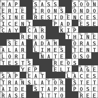 ACROSS 1. Atlas unit 4. Backtalk 8. Within a short period 12. 4th largest of the Great Lakes 14. Metal shackles 16. Southwest Nigerian state 17. Trig term 18. Dwellings 20. Ancient Celtic tribe of eastern Britain 22. Groovy apt. 23. Compass dir. 24. Island 25. 4-wheeled motor vehicle 28. Sleep 30. Western Nevada city 31. One or ones belonging to thee 35. Ocean 37. First man 40. Mouths or openings 41. Having or resembling wings 42. Citrus fruits 44. Portable shelter 45. Australian parrot (variant) 46. Nathan's nickname 47. Bear (Spanish) 48. Trials 50. Vintage cars 52. Slangy assent 54. Biblical high priest 55. Ripen 58. Plant excrement 61. Erode 63. Shoestrings 65. Interpreter 70. Proofreading order 71. Helper 72. Staphylococcus 73. Introduce or present, as a question 74. To erase 75. "Tell ____ the Marines!" 76. To riddle DOWN 1. Of or pertaining to a meson 2. N. Chile seaport 3. Abounding in pines 4. Title for a knight 5. "We ___ not amused" (Victoria) 6. Mayday 7. Clip 8. Manchild 9. Single time 10. Lyric poems 11. Sense of smell 13. Car or cant ending 15. Neighbor of Neb. 19. Prepare for publication 21. Frozen water 26. Of or related to the anus 27. "The Thinker" sculptor 29. Pictures 30. Noteworthy scarcity 32. Angers 33. Billionth: prefix 34. Eastern Standard Time (abbr.) 35. _ gin 36. Hearing organs 38. Nursemaid (var.) 39. Distance measurement (Brit.) 41. Keyboard modifier key 43. Sew up the eyelids of hawks and falcons 49. Perceives with the eye 51. Lubricate 53. Friends 55. Thespian 56. Honkers 57. First name in cosmetics 58. Play the lead 59. Roberta Peters solo 60. Groovy apts. 62. Jacques of French films 64. Viper 66. Born 67. Make lace 68. Choose 69. 17th letter of the Greek alphabet