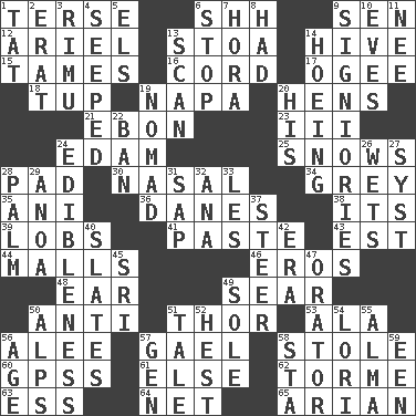 ACROSS 1. Laconic 6. Quiet! 9. Elected rep. 12. Satellite of Uranus 13. Portico 14. Hub of activity 15. Makes less strong or intense 16. Drawstring 17. Double curve, resembling the letter S 18. Uncastrated adult male sheep 19. California wine valley 20. Coop moms 21. Inky black, to poets 23. One more than two 24. Dutch treat 25. Overwhelms 28. Groovy apt. 30. Rhinal 34. Jennifer or Joel 35. Black tropical American cuckoo 36. Natives or inhabitants of Denmark 38. ___ a Wonderful Life 39. Tennis shots 41. Thick mixture 43. Eastern Standard Time (abbr.) 44. Promenades 46. Greek god of love 48. Hearing organ 49. Scorch 50. Against 51. Son of Odin 53. Insect wing 56. Toward shelter 57. Highlander 58. Took without asking 60. Global Positioning Systems (abbr.) 61. Otherwise 62. Singer Mel 63. Curvy letter 64. Fish or hair follower 65. Believer in; advocate of (suffix) DOWN 1. Make lace 2. Part of Q.E.F. 3. Tall New Zealand timber tree 4. Oozed 5. Raised railways 6. Cease 7. Israeli folk dance 8. Possessed 9. Seigniories (variant) 10. Nights before holidays 11. Born 13. Examine hastily 14. Weeding 19. Wanderer 20. Part of HMS, perhaps 22. Bar 24. The property of being fit to eat 26. Moistens 27. System (abbr.) 28. Inside of hand 29. Small Philippine buffalo 31. Plant excrement 32. Santa ___, CA 33. French article 37. Navigate 40. Chalkboards 42. Period 45. _ Lanka 47. Speaker 49. Not divided or shared with others 50. High mountains 51. Falsehood 52. Behest 54. Australian parrot (variant) 55. _ mater 56. Mature 57. Commissioned mil. rank 58. R.R. building 59. Car or cant ending