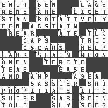 ACROSS 1. Send forth 5. Benjamin's nick name 8. Fails to keep up a pace 12. French philosopher Descartes 13. "We ___ not amused" (Victoria) 14. It is permitted: Lat. 15. Comedian Laurel of Laurel & Hardy 16. Rotating or pertaining to rotation 19. Car or cant ending 20. Refrain by choice 21. Posterior 23. Had dinner 24. Affectionate concern, for short 27. Smile enhancers 30. Musical group of three 31. Motion picture awards 34. Assist 35. Cowardly lion portrayer 38. Killed 40. Vintage cars 41. Sign of things to come 42. Cigar-shaped 44. Beverages made from leaves 45. Relaxation 46. Plus 47. Electrical Unit 50. Toward the sea 53. More disrespectful 57. Indian title of respect (Mr.) 59. Appease 63. "Tell ____ the Marines!" 64. Bake eggs in their shells 65. Slender fish 66. It's straight from the horse's mouth 67. Lacquered or enameled metalware 68. Wily 69. Observes DOWN 1. Celtic language 2. Distance measurement 3. Lacking in sense or substance 4. Nine, plus one 5. Sharp remark 6. Greek god of love 7. Remaining after all deductions 8. 54 in ancient Rome 9. Adept person 10. Set 11. Filthy place 14. Actor's bit 17. American Automobile Association (abbr.) 18. Teat (slang) 20. Caspian sea tributary 22. Oak nuts 24. Relationship diagram 25. _ and Stitch 26. 911 reaches them 28. Personal Computers (abbr.) 29. Table seasoning 30. Triplets 32. Actress Charlotte 33. Male parent of an animal 35. Globular water bottle used in Asia 36. So be it 37. Froth on beer 39. Teachers' org. 43. Russian ruler of old 47. SW Saudi Arabia district 48. Floor protector 49. Air pressure measure (abbr.) 51. First name in cosmetics 52. Nick name for Arthur 54. Droops 55. Slanted text style (abbr.) 56. Suggestive of the supernatural 58. Charged particles 59. Pacific Standard Time (abbr.) 60. 17th letter of the Greek alphabet 61. Lubricate 62. Before (prefix) 63. Big collection agency