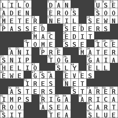 ACROSS 1. _ and Stitch 5. Daniel's nick name 8. Purpose 11. An important port of Yemen 12. Greek god of love 14. "Barney Miller" actor Jack 15. Distance measurement 17. Famous astronaut Armstrong 18. Stitched 19. Went by 21. Spring feasts 23. Apple computer (short form) 25. Prepare for publication 26. Heavy book 27. Compass dir. 28. Frozen water 31. Cuckoo 33. Before (prefix) 35. Mother 37. Clip 38. Coat; cloak 40. Greek goddess of the earth (variant) 41. Sun: prefix 43. Insidious 45. Pipe bend 46. She-sheep 47. Girls' org. (abbr.) 50. Nights before holidays 52. Angers 53. Fish or hair follower 54. Michaelmas daisies 56. A viewer who gazes fixedly 61. Naughty children 62. Port city in Latvia 65. N. Chile seaport 66. Friend of Pooh 67. At sea 68. Draw slowly or heavily 69. Be seated 70. Beverage made from leaves 71. Change direction abruptly DOWN 1. Desk light 2. The main thing one is thinking about 3. Allows 4. Washington bills 5. Lair 6. "We ___ not amused" (Victoria) 7. Annoying sounds 8. One who uses or employs something 9. Sty mamas 10. Period of immesurable duration 13. Bobsleighs 16. San ____ (Riviera town) 18. Put into a specified state 20. Moist 22. South Vietnam president (1954) 24. Certainty 26. Native american tent (variation) 28. Slanted text style (abbr.) 29. To provide with a ceiling 30. Period 31. Afresh 32. The longest river in the world 34. Greek goddess of the dawn 36. Eons 37. A female animal or person 39. Small, secluded valley 42. Legendary monster 44. Jacques Cousteau's middle name 48. Father Junipero _ 49. Help 51. Singer James 52. It is 54. Mine, in Marseilles 55. Blemish 57. Curves 58. Monetary unit of Yemen 59. Shade of tan 60. Pace 61. Big collection agency 63. Turn to the right 64. Auto club (abbr.)