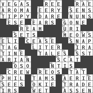 ACROSS 1. Viva Las _ 6. Portuguese money of account (variant) 9. Actress Charlotte 12. Scent 13. Suggestive of the supernatural 14. Elected reps. 15. Likely to tip or tilt 16. Have the gumption 17. Religious women 18. Compass dir. 19. Hearing organs 20. Went 21. 480, 500 or 516 sheets of paper 23. RI univ. 24. Arranges properly for use 25. Catcalls? 28. Connecticut Ivy Leaguer 30. Desist 34. Fastener 35. Label 36. 61 cubic inches 38. Lyricist Gershwin 39. Prong on a fork 41. Lies 43. Fast jet (abbr.) 44. Believer in; advocate of (suffix) 46. Scram! 48. Bear (Spanish) 49. Nuclear Threat Initiatives 50. Ship's personnel 51. Vintage cars 53. Make lace 56. Silvers or Donahue 57. Scottish caps 58. Nest on high 60. Observes 61. Migrant worker of the '30s 62. Buy and sell 63. Big collection agency 64. Soggy 65. NE Netherlands city DOWN 1. Large container 2. One of the Great Lakes 3. Republicans 4. Electrical Unit 5. Declare 6. Tail end 7. Blunders 8. Sight organ 9. One who advocates reunion 10. Queen of England 1702-14 11. Double-curved letter 13. Dutch treat 14. Sounds asleep 19. Artist's stand 20. Chewing product 22. And so on (abbr.) 24. Seigniories (variant) 26. Armed conflicts 27. Petty quarrel 28. Singer James 29. Den 31. Small island 32. R.R. building 33. Snakelike fish 37. Musical pauses 40. Artist's stands 42. _-fi 45. At this time 47. Michaelmas daisies 49. Sense of smell 50. "Mermaids" star 51. Libertine 52. Give off 54. Caspian sea tributary 55. Periodic rise and fall of the sea level 56. Air pressure measure (abbr.) 57. Pull behind 58. "One Day ___ Time" 59. Car or cant ending