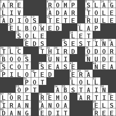 ACROSS 1. "We ___ not amused" (Victoria) 4. Play 8. Volcanic refuse 12. 54 in ancient Rome 13. The sixth month of the Jewish calendar 14. Lacquered or enameled metalware 15. Goodbye (Sp.) 18. Wig 19. Court order 20. Turned at an angle; bent 22. Infant locale 23. Flatfish 24. Allow 25. Begley and Asner 26. French poetic form 30. Affectionate concern, for short 33. One of three equal parts 36. Aroma 37. Expressions of contempt or scorn 39. Single; one (prefix) 40. Naked 41. Highlander 42. Gospel singer Marvin 44. Teachers' org. 45. Manned the helm 47. Epoch 50. Cooking vessel 51. Hang loosely or laxly 53. Elect 54. Choose not to consume 57. Australian parrot (variant) 59. San ____ (Riviera town) 61. Nick name for Arthur 63. SW Asia republic 64. Small Philippine buffalo 65. Raised railways 66. Mild oath, euphamism for damn 67. Prepare for publication 68. To sift DOWN 1. Wing 2. Travel on an animal 3. Vices 4. Pace 5. Wrote a lyric poem 6. Floor protector 7. Before (prefix) 8. Ski resort town in Vermont 9. Central Nebraska county 10. 100% 11. Turn to the right 16. Mitch Miller's instrument 17. Disposed of to a purchaser 21. Compass direction 22. French article 24. Directed 26. Indian titles of respect 27. Goddess of spring and wife of Bragi 28. Thickened enlargement 29. Type of rug 30. Cook's measure (abbr.) 31. Locales 32. Calm and collected 34. Became colored 35. _ tizzy (2 wds.) 38. Discontinuing 42. Arrange properly for use 43. Snakelike fish 46. Small child 48. Round or rotation of duties 49. Having or resembling wings 52. 61 cubic inches 53. Northwest Algerian city 54. Mine, in Marseilles 55. Water vessel 56. Mediterranean tributary 57. Hat (slang) 58. Mouth or opening 59. Actress Charlotte 60. Conclude 62. Compass dir.
