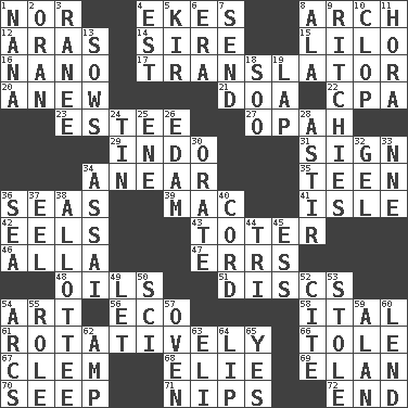 ACROSS 1. Not either 4. Supplements with great effort 8. Bowlike part 12. Ancient river in northeast Turkey 14. Father 15. _ and Stitch 16. Billionth: prefix 17. Interpreter 20. Afresh 21. ___ good deed 22. Tax preparer (abbr.) 23. First name in cosmetics 27. Brightly colored fish 29. Southeast Asian peninsula 31. Public display of a written message 34. Approach 35. Adolescent 36. Oceans 39. Big _ 41. Small island 42. Snakelike fish 43. Carrier 46. Silent film actress Nazimova 47. Blunders 48. Lubricates 51. Plates 54. Tate display 56. Environmental prefix 58. Slanted text style (abbr.) 61. Happening in regular succession 66. Lacquered or enameled metalware 67. Clement's nick name 68. Writer Wiesel 69. Style 70. Ooze 71. Cuts off 72. Conclude DOWN 1. Nanny 2. NW Algerian seaport 3. The wife of a rajah (variant) 4. Eastern Standard Time (abbr.) 5. Apertif with cassis 6. Period 7. Transmit 8. In the manner of 9. Actors Guy, Robert Welles, and Clint 10. Hoof sound 11. Israeli folk dance 13. Sty mamas 18. "Barney Miller" actor Jack 19. Pet locale 24. Metal container 25. Compass dir. 26. Dutch treat 28. Having gotten out of bed 30. Speak pompously 32. Set 33. Compass dir. 34. Slender Brazilian palm 36. Ocean 37. Snakelike fish 38. One to whom something is allotted 40. Drawstring 44. Three (prefix) 45. Curvy letter 49. Allow 50. _-fi 52. Quote 53. Took without asking 54. Arches 55. Hero or heavy, e.g. 57. Baking chamber 59. Actor Alda or Thicke 60. Grant temporary use of 62. Electrical Unit 63. Biblical high priest 64. Mouth edge 65. Consenting reply