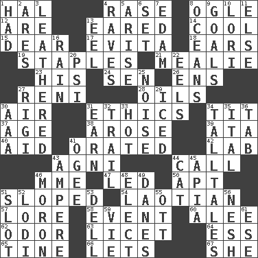 ACROSS 1. Actor Linden 4. To erase 8. Stare at amorously 12. "We ___ not amused" (Victoria) 13. Having ears or earlike features 14. Calm and collected 15. Letter starter 17. Webber/Rice musical 18. Hearing organs 19. Paper fasteners 21. Ear of corn 23. Part of HMS, perhaps 24. Elected rep. 26. Followers of ems 27. Painter Guido (1575-1642) 28. Petroleums 30. Wind 31. Principles of right and wrong 34. Teat (slang) 37. Mature 38. Came up 39. "One Day ___ Time" 40. Assist 41. Declaimed 42. Experiment locale 43. Hindu god of fire 44. Give a ring to 46. Madame (abbr.) 47. Directed 50. Fitting 51. Had an oblique or slanted direction 54. Of or relating to Laos or its people 57. Old wives' tales, e.g. 58. Incident 60. Toward shelter 62. Aroma 63. It is permitted: Lat. 64. Double-curved letter 65. Prong on a fork 66. Allows 67. A female animal or person DOWN 1. Possessed 2. Ancient Greek god of war 3. Tough but pliablecoriaceous 4. All-night dance parties 5. Originate 6. Put into a specified state 7. Dutch treat 8. Seas 9. Finish lines 10. Australian parrot (variant) 11. Otherwise 13. Snakelike fish 16. Water falling in drops from the sky 20. Air pressure measure (abbr.) 22. Snakelike fish 25. Annoying sound 27. Swiss mountan, "Queen of the Mountains" 29. On the rocks 30. Auto club (abbr.) 31. Merit 32. Get behind 33. Being at a high temperature 34. Baron Munchausen's specialties 35. Slanted text style (abbr.) 36. Bar bill 41. Double curve, resembling the letter S 43. Electrical Unit 44. Domesticated feline 45. Capital of Western Samoa 46. Person of subnormal intelligence 48. Opt 49. Natives or inhabitants of Denmark 51. Slit 52. Farming town in central California 53. Small valley 55. Baseball player Mel 56. Delicate 59. Compete 61. Compass dir.