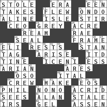 ACROSS 1. Fur scarf 6. Period 9. Car or cant ending 12. Receives possession of 13. Soared 14. Southwest Nigerian state 15. Place in a line 16. Small island 17. Move through with a circular motion 18. Corporate head (abbr.) 19. Jennifer or Joel 20. 1/640 square mile 21. 480, 500 or 516 sheets of paper 23. Actress Charlotte 24. Lick closed 25. Movie unit 28. Connecticut Ivy Leaguer 30. Musical pauses 34. Comedian Laurel of Laurel & Hardy 35. Label 36. Ascend 38. It would 39. Prong on a fork 41. Ancient Celtic tribe of eastern Britain 43. Double-curved letter 44. Believer in; advocate of (suffix) 46. Ancient Greek god of war 48. Bear (Spanish) 49. Slanted text style (abbr.) 50. Group working together 51. Cause to be 53. Greek goddess of the dawn 56. Silvers or Donahue 57. Words to Nanette 58. Bitter 60. Observes 61. Actor Alda or Thicke 62. Having lost freshness 63. Big collection agency 64. Set 65. NE Netherlands city DOWN 1. R.R. building 2. Baby powder 3. Migrant worker of the '30s 4. Poe poem 5. Compass dir. 6. Otherwise 7. Trust 8. Deep reverence 9. Pleas 10. Singer Brickell 11. And not 13. Become taut 14. Motion picture awards 19. An organ shaped like a helmet 20. Sandy's bark 22. Hearing organ 24. Seigniories (variant) 26. Floor protectors 27. Extremities 28. Singer James 29. Den 31. _ Lanka 32. Nervous spasm 33. Compass dir. 37. Related on the mother's side 40. Artist's stands 42. Lyricist Gershwin 45. Immediately 47. Chooses 49. Image 50. "Mermaids" star 51. Undercover agent 52. Of or related to the anus 54. Mouths or openings 55. Drop; flow; fall 56. 23rd letter of the Greek alphabet 57. Tired old horse 58. White ___ sheet 59. Lair