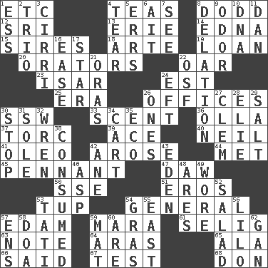 ACROSS 1. And so on (abbr.) 4. Beverages made from leaves 8. Texas town _ City 12. Indian title of respect (Mr.) 13. 4th largest of the Great Lakes 14. Pulitzer Prize-winning author Ferber 15. Male parents of animals 18. Johnson of "Laugh-In" 19. Grant temporary use of 20. Speakers 22. Boat paddle 23. Austrian river, tributary to the Danube 24. Eastern Standard Time (abbr.) 25. Epoch 26. Public positions 30. Compass dir. 33. Odor 36. Water jar 37. Torque (variant) 39. Adept person 40. Famous astronaut Armstrong 41. Butter sub 42. Came up 44. Was introduced to 45. Pre-World Series prize 47. Simpleton 50. Compass dir. 51. Greek god of love 53. Uncastrated adult male sheep 54. Commissioned military rank 57. Dutch treat 59. Hindu Mythology: god of death 61. Major League Baseball Commissioner Bud 63. Short letter 64. Ancient river in northeast Turkey 65. Insect wing 66. Expressed in words 67. Trial 68. Spanish title DOWN 1. Curvy letter 2. Musical group of three 3. High-altitude cloud 4. Separate forcefully 5. Blunders 6. Small island 7. Observe 8. Accusation by an informer 9. Scent 10. Heredity factor (abbr.) 11. Daniel's nick name 16. Comfort 17. Play the lead 21. Mouths or openings 22. Order of Saint Francis (abbr.) 24. Newt 26. Singles 27. Clement's nick name 28. Writer Wiesel 29. Table seasoning 30. Constrict 31. Not divided or shared with others 32. Songbird 34. Heavy open wagon 35. Environmental prefix 38. Ingested 42. One (Scot) 43. Paradise 46. Viper 48. Ancient Greek god of war 49. Had on 52. Vegetable dish 53. Jacques of French films 54. Pate de foie ____ 55. Compass direction 56. _ and Stitch 57. Followers of ems 58. ___ good deed 59. Floor protector 60. "We ___ not amused" (Victoria) 62. Separate the seeds from cotton