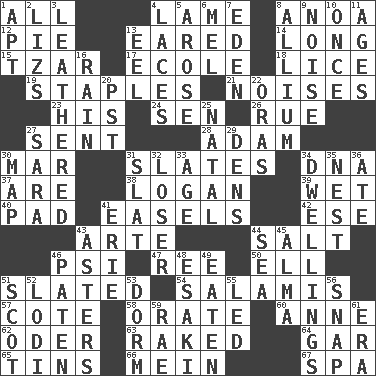 ACROSS 1. Everything 4. Unable to walk 8. Small Philippine buffalo 12. Sliced dessert 13. Having ears or earlike features 14. Having great length 15. Russian ruler 17. Learning spot: Fr. 18. Louse (plural) 19. Paper fasteners 21. Annoying sounds 23. Part of HMS, perhaps 24. Elected rep. 26. Regret 27. Transmitted 28. First man 30. Make imperfect 31. Chalkboards 34. Heredity factor (abbr.) 37. "We ___ not amused" (Victoria) 38. Utah city north of Ogden 39. Soggy 40. Writing tablet 41. Artist's stands 42. Compass dir. 43. Johnson of "Laugh-In" 44. Table seasoning 46. Air pressure measure (abbr.) 47. To riddle 50. Pipe bend 51. Scheduled 54. Deli grouping 57. ____ d'Azur (French Riviera) 58. Declaim 60. Singer Murray 62. River in Europe 63. Moved through 64. Slender fish 65. Canisters 66. Count _ (2 wds.) 67. Health resort DOWN 1. Fitting 2. Belonging to Elizabeth 3. Tough but pliablecoriaceous 4. Shoestrings 5. Came up 6. Cartoonist voice _ Blanc 7. Paradise 8. Plant genus of onion and garlic 9. Annoying sound 10. At one time in the past 11. Grows older 13. Snakelike fish 16. Precipitation 20. Pacific Standard Time (abbr.) 22. Mouths or openings 25. Brizilian seaport 27. "Two Mules for Sister ____" 29. Hiding places for outlaws 30. Atlas unit 31. Narrow board 32. Failure 33. Ripen 34. Residences 35. A home for chicks 36. Had dinner 41. 4th largest of the Great Lakes 43. Michaelmas daisies 44. Ocean 45. _ mater 46. Eucharist need 48. 1973 Nobel Price Winner (Physics) Leo 49. Consumed 51. Native of Scotland 52. Farming town in central California 53. Dormintory (informal) 55. Directed 56. Fastener 59. Actress Charlotte 61. Epoch