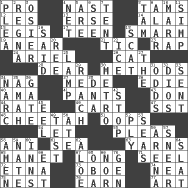 ACROSS 1. Adept person 4. Political cartoonist Thomas 8. Scottish caps 12. French article 13. Celtic language 14. Jai ____ 15. The front part of a cuirass 17. Adolescent 18. Excessive but superficial compliments 19. Approach 21. Nervous spasm 23. Reproach for some lapse or misdeed 24. Satellite of Uranus 26. Domesticated feline 28. Letter starter 30. Modes 34. Tired old horse 37. Ancient Persian 39. Singer Brickell 40. Housemaid (var.) 41. Leg coverings 43. Spanish title 44. Assign a rank or rating to 46. Heavy open wagon 47. Fast jet (abbr.) 48. Leopard's kin 51. I made a mistake 54. Allow 55. Entreaties 58. Cuckoo 61. Ocean 63. Entertaining tales 65. French painter Edouard 67. Having great length 71. Sew up the eyelids of hawks and falcons 72. Inactive volcano in Sicily 73. Mitch Miller's instrument 74. Teachers' org. 75. Egg locale 76. Merit 77. Nonscientific branch of learning DOWN 1. Entreaty 2. Rain (Swedish) 3. Flexible twig of a willow tree 4. Fish or hair follower 5. "We ___ not amused" (Victoria) 6. Compass dir. 7. Portable shelter 8. Scottish cap 9. Having or resembling wings 10. Hindu Mythology: god of death 11. Simple or foolish person 16. Alleged 18. Go away! 20. Portuguese money of account (variant) 22. Frozen water 25. Desk light 27. Definite Article 29. Arrive at 30. Paris' subway 31. Probability 32. "Vaya con ____" 33. Transmitted 34. Drug cop 35. Nanny 36. Yard entry 38. Heredity factor (abbr.) 42. Obstruct or block passage 45. Snakelike fish 49. Trial 50. Had dinner 52. Travel a route regularly 53. Oceans 56. Sports stadium 57. Scornful expression 58. So be it 59. Nathan's nickname 60. Restaurants 62. _ vera 64. Narrow board 66. Ingest 68. Chief or king in Benin or Nigeria 69. Not either 70. Commissioned mil. rank