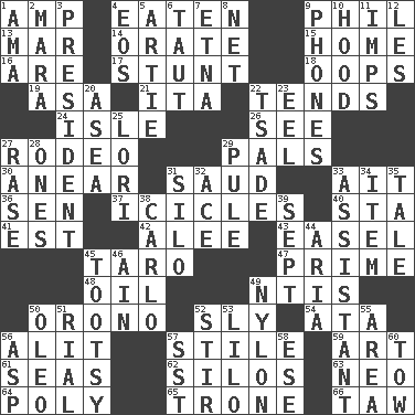 ACROSS 1. Electrical Unit 4. Consumed 9. Silvers or Donahue 13. Make imperfect 14. Declaim 15. Residence 16. "We ___ not amused" (Victoria) 17. Check the growth or development of 18. I made a mistake 19. White ___ sheet 21. Call ___ day 22. Watches over 24. Small island 26. Observe 27. Cowboy competition 29. Friends 30. Approach 31. Saudi Arabian king (1953-1964) 33. Small island 36. Elected rep. 37. Winter's stalactites 40. R.R. building 41. Eastern Standard Time (abbr.) 42. Toward shelter 43. Artist's stand 45. Edible starchy tuberous root 47. First class 48. Lubricate 49. Nuclear Threat Initiatives 50. U. of Maine site 52. Mischievous 54. _ moment's notice (2 wds.) 56. Set down 57. Vertical member of a panel or frame 59. Nonscientific branch of learning 61. Oceans 62. Grain storage towers 63. Modern: prefix 64. Much (prefix) 65. Heavy duty weighing machine 66. The 23rd letter of the Hebrew alphabet DOWN 1. Housemaid (var.) 2. Hindu Mythology: god of death 3. Elected leader of a country 4. Greek goddess of the dawn 5. Nick name for Arthur 6. Drawn tight 7. Inactive volcano in Sicily 8. Fish or hair follower 9. Gives a jingle 10. Parka part 11. Naughty children 12. French article 20. At sea 22. Sadhe (variant) 23. Snakelike fish 25. Australian parrot (variant) 27. Raze (variant) 28. Singles 29. Whine 31. Grain storage tower 32. Adept person 33. Helper 34. A whole individual unit 35. Lie 38. Monte _, Las Vegas Hotel/Casino 39. Back-to-school mo. 44. Roberta Peters solo 45. A girl or young woman (variant) 46. The 18th letter of the Arabic alphabet 49. High-strength synthetic material 50. Butter sub 51. Monetary unit of Yemen 52. Use a swizzle stick 53. _ and Stitch 55. Length times width 56. Cleo's killer 57. Fast jet (abbr.) 58. Compass dir. 60. Pull behind