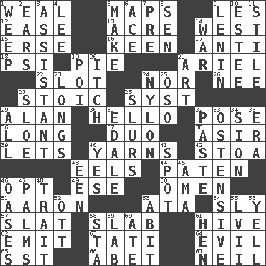ACROSS 1. Welt 5. Atlas contents 9. French article 12. Comfort 13. Land measure 14. 270 degrees 15. Celtic language 16. Peachy ____! 17. Against 18. 23rd letter of the Greek alphabet 19. Sliced dessert 21. Satellite of Uranus 22. Narrow opening 24. Or not 26. Born 27. Unemotional 28. System (abbr.) 29. Actor Alda or Thicke 30. Phone greeting 32. Airs 36. Protracted 37. Superhero pair 38. SW Saudi Arabia district 39. Allows 40. Tall tales 42. Portico 43. Snakelike fish 44. Eucharist need 46. Choose 49. Compass dir. 50. Presage 51. Composer Copland 53. _ moment's notice (2 wds.) 54. Insidious 57. Narrow board 58. Thick slice 61. Hub of activity 62. Send forth 63. Jacques of French films 64. Morally bad or wrong 65. Fast jet (abbr.) 66. Collude with 67. Famous astronaut Armstrong DOWN 1. Shed a tear 2. Hearing organs 3. Aide 4. Area sheltered from the wind 5. Create 6. Adept person 7. Before (prefix) 8. Elected rep. 9. Soviet premier 1918-24 10. First name in cosmetics 11. Vertical member of a panel or frame 14. Armed conflict 19. Luau course 20. Hankering 21. Tate display 23. Yearns 24. High-strength synthetic material 25. Bear (Spanish) 27. _ gin 28. Plays smoothly or legato 29. Everything 31. Peak District village in England 32. Thick mixture 33. Clearly or manifestly demonstrative 34. The Jewish people; Israel 35. Epoch 40. Affirmative reply 41. Specific locale 43. Car or cant ending 45. Housemaid (var.) 46. Fertile tracts in a desert 47. Insides of hands 48. Distinguishing feature 52. Baseball player Mel 53. "This won't hurt ____!" 55. 57 in ancient Rome 56. Shout 58. R.R. building 59. Experiment locale 60. Had dinner 61. Layer
