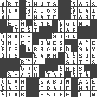 ACROSS 1. Tate display 4. Obscenities 9. Backtalk 13. By way of 14. Saint headwear 15. Mountain range southwest of Kyrgyzstan 16. 100% 17. Maternal 18. Small pie 19. Shade tree 21. Compass dir. 22. Group of southern Bantu languages 24. Trial 26. Rowing implement 27. Sadhe (variant) 29. The Jewish people; Israel 30. An arm off of a larger body of water 31. Washington bills 33. Had dinner 36. Sliced dessert 37. Moved like an arrow 40. Declare 41. ___ a Wonderful Life 42. Merit 43. Come out of 45. Monetary unit of Yemen 47. Sets of matching outer garments 48. The grampus (Milton) 49. "______ My Girl" (Turtles hit) 50. Box-office sellout 52. Scottish cap 54. R.R. building 56. Burrowing marine mollusk 57. Unit of acoustic absorption 59. Mature 61. Have the gumption 62. Peak District village in England 63. Compass dir. 64. Play the lead 65. First name in cosmetics 66. Metal container DOWN 1. Actress Gardner 2. Cause heat under the collar 3. Baron Munchausen's specialties 4. A female animal or person 5. French painter Edouard 6. ____ Bator 7. Haul 8. Compass dir. 9. Titan orbits this 10. Actor Alda or Thicke 11. Indian skirt 12. Be seated 20. Ancient Persian 22. Annoying sound 23. E Mali city 25. Bristle 27. Native american tent (variation) 28. In a ____ (agitated or irritated) 29. Stitched 31. Of the mouth 32. And not 33. Helper 34. Strained 35. Snake ____ (dice throw) 38. Arrive at 39. Food container 44. Takes to court 45. Nomad 46. Big collection agency 49. Grin 50. Narrow board 51. Hindu Mythology: god of death 52. Small boys 53. Blind as ____ 55. Hindu god of fire 56. Music discs 57. Observe 58. Born 60. Car or cant ending