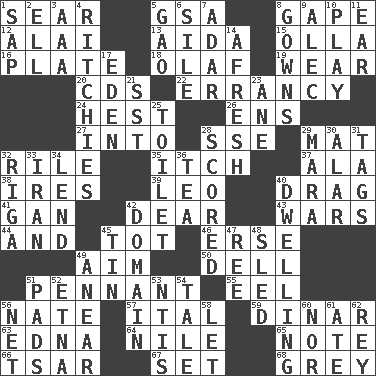 ACROSS 1. Burn superficially 5. Girls' org. (abbr.) 8. Yawn 12. Jai _ 13. Opera by Verdi 15. Spanish pot 16. Food holder 18. Norwegian king 19. Erode 20. Music discs 22. Tendancy to err 24. Command 26. Followers of ems 27. To the inside or interior of 28. Compass dir. 29. Floor covering 32. Cause heat under the collar 35. Hankering 37. According to 38. Angers 39. Lion 40. To trail on the ground 41. Separate the seeds from cotton 42. Letter starter 43. Armed conflicts 44. Also 45. Small child 46. Celtic language 49. Direct toward a target or goal 50. Small valley 51. Pre-World Series prize 55. Snakelike fish 56. Nathan's nickname 57. Slanted text style (abbr.) 59. Middle Eastern gold or silver currency 63. Pulitzer Prize-winning author Ferber 64. Mediterranean tributary 65. Musical sound 66. Russian ruler of old 67. Put into a specified state 68. Jennifer or Joel DOWN 1. Plant excrement 2. Pipe bend 3. American Automobile Association (abbr.) 4. Actors Guy, Robert Welles, and Clint 5. E Mali city 6. Filth; sediment 7. The sixth month of the Jewish calendar 8. Brides' dresses 9. Actor Baldwin 10. Live dramatic performance 11. Hearing organ 14. Anew 17. Locale of original sin 21. Fast jet (abbr.) 23. One (Scot) 25. Bathroom 28. Tallied 29. Hindu Mythology: god of death 30. Having or resembling wings 31. Labels 32. Port city in Latvia 33. SW Asia republic 34. Grant temporary use of 36. Afternoon social gathering 40. Home 42. Realm 45. Shallow baking pan 47. To separate or throw off 48. Downhill vehicle 49. Approach 51. Groovy apts. 52. Inactive volcano in Sicily 53. Nuclear Threat Initiatives 54. Falsehood 56. Fish or hair follower 58. Allow 60. And not 61. Had dinner 62. Marina Del _, California
