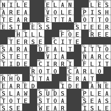 ACROSS 1. Mediterranean tributary 5. Enthusiasm 9. French article 12. Type of rug 13. Short-tailed, large-bodied rat 14. Expression of disdain 15. Rend 16. Singer James 17. Von Bismarck 18. Eastern Standard Time (abbr.) 19. Curvy letter 21. Guide 22. Land elevation 24. Enemy 26. Portuguese money of account (variant) 27. Laconic 28. Quote 29. "Two Mules for Sister ____" 30. Started a card game 32. "Tell ____ the Marines!" 36. Proofreading order 37. By way of 38. Drug cop 39. Event that recurs at intervals 40. High-altitude cloud 42. Secret move to avoid paying debts 43. Printing process, for short 44. Monte _, Las Vegas Hotel/Casino 46. 17th letter of the Greek alphabet 49. Call ___ day 50. Part of Q.E.F. 51. Having ears or earlike features 53. Binary compound 54. One (Scot) 57. Cole _ (cabbage dish) 58. Soap bubbles 61. Entreaty 62. Carry 63. Portico 64. Oceans 65. Compass dir. 66. Erode 67. Small island DOWN 1. Nathan's nickname 2. Angers 3. Resembling or made to resemble leather 4. Hearing organ 5. Nights before holidays 6. Car dealer's back yard 7. The first octave above the treble staff 8. Teachers' org. 9. 61 cubic inches 10. First name in cosmetics 11. Dinah or Pauly 14. Plant holder 19. Raised railways 20. Downhill vehicle 21. Perceive with the eye 23. Feeling or showing extreme anger 24. Having threads 25. Baseball player Mel 27. Jacques of French films 28. Capital of Egypt 29. Fast jet (abbr.) 31. Webber/Rice musical 32. Kind of red light 33. Baron Munchausen's specialties 34. Musical group of three 35. Sep. follower 40. Small bed 41. On the rocks 43. To free from 45. "We ___ not amused" (Victoria) 46. Musical pauses 47. Radiant circles of light 48. Speak pompously 52. She-sheep 53. Austrian river, tributary to the Danube 55. Actress Patricia 56. Relaxation 58. Compass dir. 59. Shoshoni 60. ___ good deed 61. Air pressure measure (abbr.)