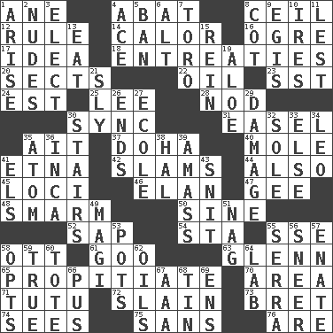 ACROSS 1. One (Scot) 4. Blind as ____ 8. To provide with a ceiling 12. Governing power 14. Bodily heat indicating an inflammation 16. Legendary monster 17. It may be bright or harebrained 18. Pleas 20. Religious groups 22. Petroleum 23. Fast jet (abbr.) 24. Eastern Standard Time (abbr.) 25. Area sheltered from the wind 28. Allow head to fall sleepily 30. Synchronize (abbr.) 31. Artist's stand 35. Small island 37. Capital of the state of Qatar 40. Undercover agent 41. Inactive volcano in Sicily 42. Hits or strikes with great force 44. In addition 45. Event scenes 46. Flair 47. Turn to the right 48. Excessive but superficial compliments 50. Trig term 52. Plant excrement 54. R.R. building 55. Compass dir. 58. Baseball player Mel 61. Thick or sticky substance 63. American astronaut and politician John 65. Appease 70. Type of rug 71. Ballerina skirt 72. Killed 73. Cy Young winner Saberhagen 74. Perceives with the eye 75. Without 76. "We ___ not amused" (Victoria) DOWN 1. Ascend 2. Unadorned figures 3. Opt 4. Adept person 5. Prohibit 6. The first octave above the treble staff 7. "Corrida" creature 8. Small bed 9. Armor plate that protects the chest 10. Angers 11. For fear that 13. Erode 15. It's straight from the horse's mouth 19. _ vera 21. Cunning 26. Conclusions 27. Learning spot: Fr. 29. Break 30. Flight of steps 32. Flatfish 33. Otherwise 34. Lion 35. Smallest unit of an element 36. South American Indian 38. Actor Linden 39. Collect or gather 41. Raised railways 43. In a ____ (agitated or irritated) 49. Wise men 51. Tired old horse 53. Plant holders 55. Spanish missionary in California 56. Contemptuous expression 57. Maternal 58. Chooses 59. Loyal 60. Carry 62. Lubricates 64. Experiment locale 66. Purulenc 67. American Automobile Association (abbr.) 68. Metal container 69. Followers of ems