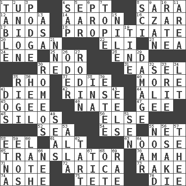 ACROSS 1. Uncastrated adult male sheep 4. Back-to-school mo. 8. "Two Mules for Sister ____" 12. Small Philippine buffalo 14. Composer Copland 16. Russian ruler of old 17. Auction offers 18. Conciliate 20. Utah city north of Ogden 22. Biblical high priest 23. Teachers' org. 24. Compass dir. 25. Not either 28. Conclude 30. Redecorate 31. Artist's stand 35. 17th letter of the Greek alphabet 37. Singer Brickell 40. Greater amount 41. South Vietnam president (1954) 42. Wash lightly 44. Came down and settled, as after flight 45. Double curve, resembling the letter S 46. Nathan's nickname 47. Unit of force equal to gravity 48. Grain storage towers 50. Otherwise 52. Ocean 54. Compass dir. 55. Fish or hair follower 58. Snakelike fish 61. The first octave above the treble staff 63. Trap for birds or small mammals 65. Interpreter 70. Nursemaid 71. Musical sound 72. N. Chile seaport 73. Immoral or dissolute person 74. American tennis player Robert 75. Wig 76. Expire DOWN 1. Eating place 2. The state of being joined or united 3. Porridge 4. Plant excrement 5. Ewer handle 6. Adept person 7. Drink excessively 8. _-fi 9. Muslim summons to prayer 10. Assign a rank or rating to 11. Length times width 13. White ___ sheet 15. Mediterranean tributary 19. Prong on a fork 21. Compass dir. 26. River in Europe 27. "The Thinker" sculptor 29. Break 30. Lover boys 32. Not divided or shared with others 33. One of the Great Lakes 34. Allow 35. Swiss mountan, "Queen of the Mountains" 36. The bottom of a shoe or boot 38. _ tizzy (2 wds.) 39. First name in cosmetics 41. Two (Sp.) 43. Snakelike fish 49. Oceans 51. Elected rep. 53. Silent film actress Nazimova 55. Wanderer 56. 1973 Nobel Price Winner (Physics) Leo 57. Giggle 58. Inactive volcano in Sicily 59. Greek god of love 60. Thin strip of wood or metal 62. Small pie 64. Rowing implement 66. Born 67. Standoff 68. Sep. follower 69. Actress Charlotte