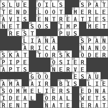 ACROSS 1. Turn sharply 5. Lubricates 9. Petty quarrel 13. Watch over 14. Spoils 15. Haggard of country music 16. Opinion 17. Pleas 19. Fish or hair follower 20. Distress signal 21. Mischievous child 22. Was introduced to 23. Relief 25. Fluid product of inflammation 26. Woody, climbing, usually tropical plant 30. Connect, as a bridge 34. N. Chile seaport 35. Billionth: prefix 36. Three-handed card game 39. Cod relative 42. Baltic tributary 43. Corncob 44. Flexible twig of a willow tree 46. Flats, for short 47. Impudent aggressiveness 48. Thick or sticky substance 51. Son of Isaac 54. Wet nurse (var.) 57. Wind 58. Altar cloth linen 60. Falsehood 62. Wine waiters 65. Pulitzer Prize-winning author Ferber 66. Standard of perfection 67. Spoken 68. Soaks 69. Monthly bill 70. Nathan's nickname 71. Part of Q.E.F. DOWN 1. Comedian Laurel of Laurel & Hardy 2. Prying instrument 3. Join together 4. Begley and Asner 5. Margarine 6. Charged atoms 7. Car dealer's back yard 8. Empty completely 9. Arrange properly for use 10. Demure 11. Toward shelter 12. Trial 15. Atlas contents 18. Australian flightless bird 20. Use a swizzle stick 24. Chalkboards 27. Small island 28. Non-commissioned officer (abbr.) 29. Composer Copland 30. Sounds asleep 31. Writing tablet 32. A saturated hydrocarbon 33. Or not 36. Health resort 37. Monetary unit of Laos 38. Fitting 40. Compass dir. 41. Apertif with cassis 45. Nights before holidays 48. Highlander 49. Lubricate 50. Greek mythologigal hunter 52. Tree or shrub in the Birch family 53. National forest in Provo, Utah 54. SW Saudi Arabia district 55. Method 56. So be it 58. Naughty child 59. Small island 61. Compass direction 63. Floor protector 64. Epoch 65. She-sheep