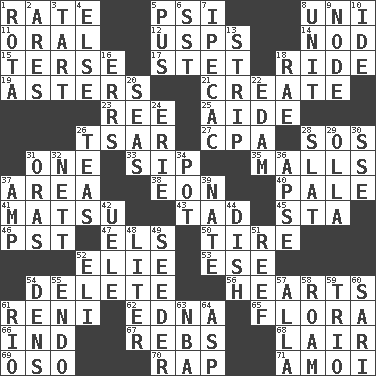 ACROSS 1. Assign a rank or rating to 5. Air pressure measure (abbr.) 8. Corn or form start 11. Of the mouth 12. United States Postal Service (abbr.) 14. Dreamland 15. Laconic 17. Proofreading order 18. Travel on an animal 19. Michaelmas daisies 21. Cause to be 23. To riddle 25. Helper 26. Russian ruler of old 27. Accounting whiz (abbr.) 28. Distress signal 31. Single 33. Small drink 35. Shopping centers 37. Type of rug 38. Period of immesurable duration 40. Diluted with white 41. Taiwanese island in East China Sea 43. Small amount or degree 45. R.R. building 46. Pacific Standard Time (abbr.) 47. Raised railways 50. Become fatigued 52. Writer Wiesel 53. Compass dir. 54. Erase 56. Centers 61. Painter Guido (1575-1642) 62. Pulitzer Prize-winning author Ferber 65. Plants 66. Indiana (abbr.) 67. Confederate soldiers (slang) 68. Den 69. Bear (Spanish) 70. Reproach for some lapse or misdeed 71. Mine, in Marseilles DOWN 1. Roll call or roster of names 2. Ancient Greek god of war 3. Small pie 4. Otherwise 5. Festering 6. Fast jet (abbr.) 7. Medicinal drug used to evoke vomiting 8. A single undivided whole 9. Connecting point 10. Binary compound 13. Empty completely 16. Blunders 18. Actress Charlotte 20. Oceans 22. Dutch treat 24. One of the Great Lakes 26. Afternoon social gatherings 28. Narrow board 29. Rounded earthenware pot or jar 30. Compass dir. 31. Mouths or openings 32. Remaining after all deductions 34. Plant holder 36. Domed church section 37. Electrical Unit 39. Nathan's nickname 42. Ubangi River tributary 44. Food container 48. 61 cubic inches 49. Sowing specialist 51. Coral ridge 52. Biblical high priest 54. Cub Scout units 55. Inside; within (prefix) 57. Silent film actress Nazimova 58. Wander 59. Musical group of three 60. Indian skirt 61. River (Sp.) 63. Basketball assoc. 64. Cleo's killer