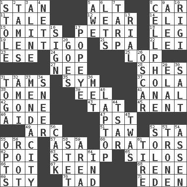 ACROSS 1. Comedian Laurel of Laurel & Hardy 5. Keyboard modifier key 8. Auto 11. Story 12. Put on (as clothing) 14. Connecticut Ivy Leaguer 15. Leaves out 17. _ dish (used to culture cells) 18. Part of a journey 19. Small, flat, pigmented spot on the skin 21. Health resort 22. Flowery wreath 23. Compass dir. 24. Grand Old Party 25. Trim (branches) 27. Born 28. "______ My Girl" (Turtles hit) 31. Scottish caps 35. Symbol (abbr.) 37. Root beer relative 38. Sign of something about to happen 39. Snakelike fish 41. Of or related to the anus 42. Went 43. Make lace 45. Monthly bill 46. Helper 47. Pacific Standard Time (abbr.) 49. Curve 51. The 23rd letter of the Hebrew alphabet 52. R.R. building 55. The grampus (Milton) 57. White ___ sheet 60. Speakers 62. Luau course 63. Empty completely 65. Grain storage towers 66. Small child 67. Peachy ____! 68. French philosopher Descartes 69. Filthy place 70. Small amount or degree 71. Paradise DOWN 1. Fur scarf 2. Domesticates 3. Place in a line 4. Remaining after all deductions 5. Deep reverence 6. Allows 7. Canvas cover 8. Portable communications device 9. Toward shelter 10. Swiss mountan, "Queen of the Mountains" 13. Monetary unit of Yemen 16. Attach a signature 17. Wimpy's pal 20. Leaves 26. Witty Wilde 29. Flair 30. Table seasoning 31. Ancient Roman robe 32. Mine, in Marseilles 33. Ananias' fault 34. Scornful expression 36. Was introduced to 40. Portable computer 44. Russian ruler of old 48. It was, poetically 50. Keg 52. Having a sole or soles 53. Marketplace scale 54. NE Netherlands city 55. Elects 56. Carrot, for example 58. Proofreading order 59. Type of rug 61. Become fatigued 64. Indiana (abbr.)