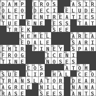 ACROSS 1. Moist 5. Greek god of love 9. SW Saudi Arabia district 13. Butter sub 14. Tenth: prefix 15. Dodge 16. Remaining after all deductions 17. Pleas 19. Third day of the wk. 20. Compass dir. 21. Double-curved letter 22. Make lace 23. Long journey 25. Perceive with the eye 26. Klaipeda city 30. Type of rug 34. Peak District village in England 35. Indian skirt 36. Independent ruler or chieftain 39. Abounding in pines 42. Connect, as a bridge 43. Toadlike animal 44. Ancient Celtic tribe of eastern Britain 46. Prong on a fork 47. Olfactory organs 48. Greek goddess of the dawn 51. Smallest unit of an element 54. Take to court 57. Mouth edge 58. Actor Linden 60. Corporate head (abbr.) 62. Interpreter 65. Letter starter 66. Match 67. Mediterranean tributary 68. Grandmother 69. To erase 70. Perceives with the eye 71. Pismires DOWN 1. Do not 2. Eskimo relative 3. Distance measurement 4. Cooking vessel 5. Locale of original sin 6. French philosopher Descartes 7. Sep. follower 8. Begets 9. The first octave above the treble staff 10. Set of matching outer garments 11. The main thing one is thinking about 12. Take ten 15. Relaxation 18. Compass dir. 20. Supplemented with great effort 24. Develop 27. Atlas unit 28. Connecticut Ivy Leaguer 29. Soviet premier 1918-24 30. Aid 31. Hit sharply and swiftly 32. Period 33. The 18th letter of the Arabic alphabet 36. Bank Draft (abbr.) 37. Medical imaging device (abbr.) 38. Electrically charged atom 40. Environmental prefix 41. It is so 45. Anneal 48. Otherwise 49. Lubricate 50. Connects, as a bridge 52. Sea 53. Intended 54. Play the lead 55. Capital and largest city of Mongolia 56. Hearing organs 58. Hollow 59. Ancient Greek god of war 61. Mouths or openings 63. Born 64. Make a knot 65. Heredity factor (abbr.)