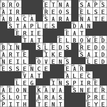 ACROSS 1. Sis' sibling 4. Inactive volcano in Sicily 8. Plant excrements 12. Wind 13. Vintage cars 14. Otherwise 15. Phillipine bananalike plant 18. "Two Mules for Sister ____" 19. Nathan's nickname 20. Paper fasteners 22. Daniel's nick name 23. One of the Great Lakes 24. Ingest 25. Make lace 26. Shoved, as through a crowd 30. Storage container 33. Bobsleighs 36. Make new 37. Johnson of "Laugh-In" 39. Eisenhower's nickname 40. Alleged 41. Famous astronaut Armstrong 42. Baking chambers 44. Directed 45. Substance 47. Hearing organ 50. Large container 51. Actor Baldwin 53. Part of a journey 54. Motivate 57. Age 59. Polynesian shrub of the pepper family 61. Scornful expression 63. Groove 64. Caspian sea tributary 65. Before (prefix) 66. Heart or essence 67. Portable shelter 68. Sight organ DOWN 1. Sound made by sheep 2. Teases 3. Declaim 4. Celtic language 5. Beverages made from leaves 6. And not 7. White ___ sheet 8. Legislators 9. Actor Alda or Thicke 10. Pacific Standard Time (abbr.) 11. Perceive with the eye 16. Draw slowly or heavily 17. Capital of Western Samoa 21. Allows 22. Pat or tap gently 24. Raised railways 26. Genesis locale 27. Welt 28. Singer Brickell 29. Texas town _ City 30. Object of repulsion 31. Angers 32. Nuclear Threat Initiatives 34. Moving, as bait 35. Supplement with great effort 38. Veterans Day date 42. Sep. follower 43. Oceans 46. Tired old horse 48. High mountains 49. It's straight from the horse's mouth 52. Streamer paper 53. Spoils 54. _ the terrible 55. Political cartoonist Thomas 56. Suggestive of the supernatural 57. Cleo's killer 58. Connecticut Ivy Leaguer 59. Krazy ___ of comics 60. "We ___ not amused" (Victoria) 62. To sift