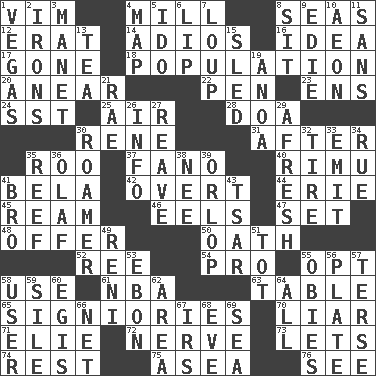 ACROSS 1. Zeal 4. Place where flour is made 8. Oceans 12. Part of Q.E.F. 14. Goodbye (Sp.) 16. It may be bright or harebrained 17. Went 18. Census information 20. Approach 22. Fenced enclosure 23. Followers of ems 24. Fast jet (abbr.) 25. Atmosphere 28. ___ good deed 30. French philosopher Descartes 31. Following 35. Friend of Pooh 37. Papal veil 40. Tall New Zealand timber tree 41. Actor Lugosi 42. Unconcealed 44. One of the Great Lakes 45. 480, 500 or 516 sheets of paper 46. Snakelike fish 47. Put into a specified state 48. Auction bid 50. Pledge 52. Portuguese money of account (variant) 54. Adept person 55. Elect 58. Purpose 61. Basketball assoc. 63. Eating place 65. Seigniories (variant) 70. One who doesn't tell the truth 71. Writer Wiesel 72. Impudent aggressiveness 73. Allows 74. Take ten 75. At sea 76. Observe DOWN 1. Viva Las _ 2. Metal shackles 3. French painter Edouard 4. Atlas unit 5. Wedding promise 6. Mouth edge 7. Central Nebraska county 8. Be seated 9. Singer Brickell 10. Age 11. Without 13. Beverage made from leaves 15. Downhill vehicle 19. Small Philippine buffalo 21. Actress Charlotte 26. A message received and understood 27. Rob, plunder, or pillage 29. Anew 30. Nomad 32. Become fatigued 33. Send forth 34. Regret 35. Coral ridge 36. Norwegian king 38. Born 39. Fourth or lowest deck 41. Sis' sibling 43. Russian ruler of old 49. Painter Guido (1575-1642) 51. Small child 53. Inky black, to poets 55. Off-Broadway awards 56. Food holder 57. Laconic 58. One who uses or employs something 59. Filth; sediment 60. Armor plate that protects the chest 62. Type of rug 64. 100% 66. Fish or hair follower 67. Big collection agency 68. First lady 69. Ocean