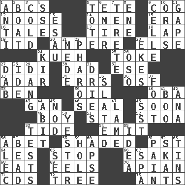 ACROSS 1. Lettered men learn these first 5. False hair 9. Gear tooth 12. Trap for birds or small mammals 14. Sign of something about to happen 15. Epoch 16. Falsehoods 17. Become fatigued 18. Infant locale 19. It would 20. Electrical Unit 23. Otherwise 24. Malaysian steamed pastry 25. Puff or smoke 27. "You Light Up My Life" star Conn 30. Male parent 32. Compass dir. 33. The sixth month of the Jewish calendar 34. Blunders 36. Order of Saint Francis (abbr.) 38. Benjamin's nick name 39. Lubricate 40. Chief or king in Benin or Nigeria 43. Separate the seeds from cotton 46. Lick closed 48. Within a short period 49. Male child 51. R.R. building 52. Portico 53. Periodic rise and fall of the sea level 54. Give off 56. Collude with 58. Cast a shadow over 61. Pacific Standard Time (abbr.) 64. French article 65. Close up, plug up 66. 1973 Nobel Price Winner (Physics) Leo 68. Consume 69. Snakelike fish 70. Bee-related 71. Music discs 72. Relationship diagram 73. Pismires DOWN 1. Against 2. Water vessel 3. Lacking warmth 4. Compass dir. 5. Haul 6. Arab leader 7. Cylindrical with tapered ends 8. Compass dir. 9. Cell (Danish) 10. Mouths or openings 11. Open wide 13. He sold his birthright 21. Ancient Persian 22. N Egypt peninsula 23. Supplements with great effort 24. Apertif with cassis 26. Bear (Spanish) 27. Pat or tap gently 28. Binary compound 29. Mild oath, euphamism for damn 31. Frees from moisture 35. Scheduled 37. Pick up the tab 41. Surprise greeting 42. Santa ___, CA 44. "This won't hurt ____!" 45. Dreamland 47. Unable to walk 48. Fast jet (abbr.) 50. Last 53. Trials 55. The content of cognition 56. Actor Baldwin 57. Necklace unit 59. Opening into or through something 60. Domed church section 61. Ache 62. Three-handed card game 63. Metal containers 65. Put into a specified state 67. Health resort
