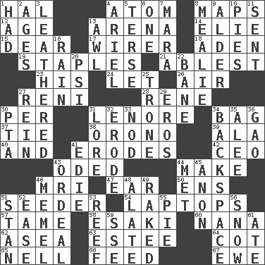 ACROSS 1. Actor Linden 4. Tiny particle 8. Atlas contents 12. Mature 13. Sports stadium 14. Writer Wiesel 15. Letter starter 17. One who wires 18. An important port of Yemen 19. Paper fasteners 21. Most capable 23. Part of HMS, perhaps 24. Allow 26. Wind 27. Painter Guido (1575-1642) 28. French philosopher Descartes 30. For each 31. Poe poem 34. Paper or plastic container 37. Standoff 38. U. of Maine site 39. In the manner of 40. Added to 41. Eats (away) 42. Corporate head (abbr.) 43. Wrote a lyric poem 44. Cause to be 46. Medical imaging device (abbr.) 47. Ewer handle 50. Followers of ems 51. Sowing specialist 54. Portable computers 57. Docile 58. 1973 Nobel Price Winner (Physics) Leo 60. Nanny 62. Toward the sea 63. First name in cosmetics 64. Small bed 65. 1994 drama film starring Jodie Foster 66. Nourish 67. She-sheep DOWN 1. Possessed 2. Eras 3. Tough but pliablecoriaceous 4. Satellite of Uranus 5. Laconic 6. Single 7. Hindu Mythology: god of death 8. Ear of corn 9. Tree or shrub in the Birch family 10. Sliced desserts 11. Posted 13. Leather borer 16. Water falling in drops from the sky 20. Air pressure measure (abbr.) 22. Object of repulsion 25. Marketplace scale 27. It's straight from the horse's mouth 29. Greek god of love 30. Parent Teacher Association (abbr.) 31. Old wives' tales, e.g. 32. Wear away 33. Lower and raise head in agreement 34. Keyboard key 35. Toward shelter 36. E Mali city 41. Singer Brickell 43. Severe or trying experience 44. Was introduced to 45. Soon (poet.) 46. Klaipeda city 48. Having winglike extensions 49. Swept the length of 51. Comedian Laurel of Laurel & Hardy 52. Comfort 53. Coral collection 55. Sliced dessert 56. Overwhelm 59. Compass dir. 61. Had dinner