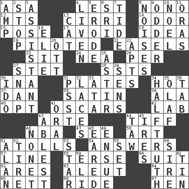 ACROSS 1. White ___ sheet 4. For fear that 8. Words to Nanette 12. Mountains (abbr.) 13. High-altitude cloud 14. Scent 15. Introduce or present, as a question 17. Shun 18. It may be bright or harebrained 19. Manned the helm 21. Artist's stands 23. Be seated 24. Teachers' org. 26. For each 27. Proofreading order 28. Fast planes 30. _ tizzy (2 wds.) 31. Food holders 34. Being at a high temperature 37. Daniel's nick name 38. Smooth fabric 39. Insect wing 40. Elect 41. Motion picture awards 42. Experiment locale 43. Johnson of "Laugh-In" 44. Small quarrel 46. Basketball assoc. 47. Observe 50. Tate display 51. Ringlike coral islands and reefs 54. Responds (to) 57. Actor's bit 58. Laconic 60. Set or collection 62. Ancient Greek god of war 63. Eskimo relative 64. Three (prefix) 65. Remaining after all deductions 66. Travel on an animal 67. Layer DOWN 1. Electrical Unit 2. Obstruct or block passage 3. Helper 4. Make or become more lively 5. Eat (away) 6. Indian title of respect (Mr.) 7. Event that recurs at intervals 8. Annoying sounds 9. More peculiar 10. Christmas carol 11. Mouths or openings 13. Domesticated feline 16. Writer Wiesel 20. Baseball player Mel 22. Tenement units (abbr.) 25. Being in motion 27. Fastener 29. Elected reps. 30. Wedding promise 31. Inconspicuous attention getter 32. Shoestrings 33. _ moment's notice (2 wds.) 34. Not exactly gospel 35. Norwegian king 36. Bar bill 41. Relating to the mouth 43. Most capable 44. The 23rd letter of the Hebrew alphabet 45. Angers 46. Music written for nine 48. Having ears or earlike features 49. Follow as a consequence or result 51. Actor Alda or Thicke 52. Hoop that covers a wheel 53. Play the lead 55. Arrange properly for use 56. Beget 59. Biblical high priest 61. Metal container
