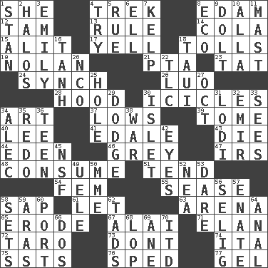 ACROSS 1. A female animal or person 4. Long journey 8. Dutch treat 12. Scottish cap 13. General guideline 14. Root beer relative 15. Set down 17. Shout 18. For Whom the Bell _____ 19. Pitcher Ryan 21. Parent Teacher Association (abbr.) 23. Make lace 24. Synchronize (abbr.) 26. Nilotic language 28. Parka part 30. Winter's stalactites 34. Nonscientific branch of learning 37. Coldest temperatures 39. Heavy book 40. Area sheltered from the wind 41. Peak District village in England 43. Pass on 44. Genesis locale 46. Jennifer or Joel 47. Big collection agency 48. Eat 51. Look after 54. Opposite of masc. 55. Gospel singer Marvin 58. Plant excrement 61. Allow 63. Sports stadium 65. Wear away 67. Jai _ 71. Flair 72. Edible starchy tuberous root 73. Do not 74. Call ___ day 75. Fast planes 76. Moved rapidly 77. Set DOWN 1. Comedian Laurel of Laurel & Hardy 2. Radiant circles of light 3. Poet Dickinson 4. Attempt 5. Regret 6. Pipe bend 7. Seaweed 8. Environmental prefix 9. Dunce 10. Silent film actress Nazimova 11. Vertical spar for supporting sails 16. Hyperbolic tangent 18. "Change" in Tahitian 20. Non-commissioned officer (abbr.) 22. Affectionate concern, for short 25. Opening into or through something 27. Sep. follower 29. Evade 30. Small island 31. Farming town in central California 32. Independent ruler or chieftain 33. Perceives with the eye 34. Actor Baldwin 35. Redecorate 36. Adolescent 38. Armed conflict 42. Sight organs 45. Science/research agcy. 49. Ubangi River tributary 50. Madame (abbr.) 52. Teachers' org. 53. Have the gumption 56. Former Milwaukee Brewers owner Bud 57. Related on the mother's side 58. Arranges properly for use 59. Ancient river in northeast Turkey 60. Left side of a ship or aircraft 62. Small boys 64. Of or related to the anus 66. Two (Sp.) 68. Trim (branches) 69. A saturated hydrocarbon 70. It would