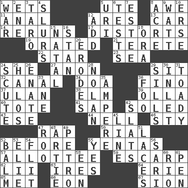 ACROSS 1. Soaks 5. Shoshoni 8. Deep reverence 11. Of or related to the anus 12. Ancient Greek god of war 13. Automobile 14. Summer TV shows 17. What propaganda does 19. Spoke pompously 21. Cigar-shaped 22. Play the lead 23. Ocean 24. A female animal or person 27. Soon (poet.) 29. Be seated 32. Lessep's creation 34. ___ good deed 36. Fine (Spanish) 37. ____ Bator, Mongolia 38. Shade tree 39. Spanish pot 40. Carryall 41. Plant excrement 42. Having a sole or soles 43. Compass dir. 44. 1994 drama film starring Jodie Foster 46. Filthy place 47. Reproach for some lapse or misdeed 50. Monetary unit of Yemen 52. Prior to 55. Gossips 57. One to whom something is allotted 59. Fortification 62. Cards in a Roman deck? 63. Angers 64. One of the Great Lakes 65. Was introduced to 66. A really long time 67. The Jewish people; Israel DOWN 1. Armed conflict 2. Compass dir. 3. Pacific island yam 4. Runs notes together 5. RI univ. 6. Trials 7. First name in cosmetics 8. 1/640 square mile 9. Electrical Unit 10. Celtic language 12. Increase 15. Relating to or accompanying birth 16. Comedian Laurel of Laurel & Hardy 18. Mouth or opening 20. Eats (away) 24. Scutum 25. Saint headwear 26. Maternal 28. Pitcher Ryan 29. Beverly of Met fame 30. An arm off of a larger body of water 31. Sycophant 33. A saturated hydrocarbon 35. Electrical Unit 36. Egg _ yung 42. Narrow boards 45. Actor's bit 47. Friend of Pooh 48. Nick name for Arthur 49. Stone: prefix 51. Shoestrings 52. Lip ointment 53. Writer Wiesel 54. Sudden quick movement 55. Affirmative reply 56. Indian skirt 58. Car or cant ending 60. _ de Janeiro 61. Writing instrument