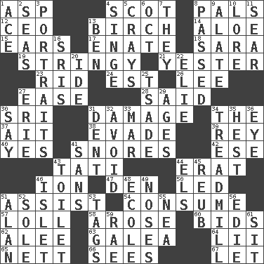 ACROSS 1. Cleo's killer 4. Native of Scotland 8. Friends 12. Corporate head (abbr.) 13. A tree used for making furniture 14. Medicinal plant 15. Hearing organs 17. Related on the mother's side 18. "Two Mules for Sister ____" 19. Slender, wiry 21. Last past 23. To free from 24. Eastern Standard Time (abbr.) 26. Area sheltered from the wind 27. Relaxation 28. Expressed in words 30. _ Lanka 31. Break 34. Definite Article 37. Small island 38. Elude 39. Marina Del _, California 40. Consenting reply 41. Sounds asleep 42. Compass dir. 43. Jacques of French films 44. Part of Q.E.F. 46. Electrically charged atom 47. Lair 50. Directed 51. Aid 54. Eat 57. Hang loosely or laxly 58. Came up 60. Auction offers 62. Toward shelter 63. An organ shaped like a helmet 64. Cards in a Roman deck? 65. Remaining after all deductions 66. Perceives with the eye 67. Allow DOWN 1. Adept person 2. Oceans 3. Likenesses of persons 4. Burn superficially 5. Trading vessels 6. Sep. follower 7. Those people 8. Went by 9. Having winglike extensions 10. Old wives' tales, e.g. 11. Singe 13. Benjamin's nick name 16. Indian titles of respect 20. Binary compound 22. Writer Wiesel 25. Sadhe (variant) 27. 4th largest of the Great Lakes 29. Eras 30. Declare 31. Scratch 32. Keep away from 33. Spoil 34. Excercise machine 35. Command 36. Sight organ 41. Without 43. Bathroom 44. Raised railways 45. Reuben's nickname 46. Small island 48. Learning spot: Fr. 49. Olfactory organs 51. ____ Jay Lerner 52. Not divided or shared with others 53. Labels 55. Teachers' org. 56. Singer Brickell 59. Actress Charlotte 61. Be seated