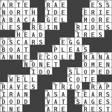ACROSS 1. Johnson of "Laugh-In" 5. Actress Charlotte 8. Curvy letter 11. Compass direction 13. Binary compound 14. 4th largest of the Great Lakes 15. Phillipine bananalike plant 16. Set 17. Greater amount 18. French article 19. It's straight from the horse's mouth 21. Amusement-park features 22. Froth on beer 24. Angers 25. Motion picture awards 27. Ovum 29. Water vessel 30. Entreaties 32. Queen of England 1702-14 33. Learning spot: Fr. 35. Nanny 39. Music written for nine 41. Sign of something about to happen 42. Wedding promise 43. Inclined 45. Not ill 48. ____ d'Azur (French Riviera) 49. All-night dance parties 50. Musical group of three 52. Strike 55. SW Asia republic 56. White ___ sheet 57. Separates forcefully 59. Texas town _ City 60. Large container 61. Gurus 62. Compass dir. 63. "We ___ not amused" (Victoria) 64. State of inaction DOWN 1. Of or related to the anus 2. Loose flowing garment 3. File 13 4. And so on (abbr.) 5. Swiss mountan, "Queen of the Mountains" 6. An important port of Yemen 7. Snakelike fish 8. Wear away 9. Fathers 10. Perceives with the eye 12. Ethiopian city, capital of Harari 14. Independent ruler or chieftain 20. Begley and Asner 21. Port city in Latvia 23. Consumed 25. Chief or king in Benin or Nigeria 26. Boy, to dad 27. Pipe bend 28. Unit of force equal to gravity 30. Cooking vessel 31. Snout, nose 33. Conclude 34. Corporate head (abbr.) 36. Electrical Measurement 37. Born 38. Added to 40. Petroleums 43. _-fi 44. Plunders 45. Make _____ (do battle with) 46. Elude 47. Grant temporary use of 49. Travel on an animal 50. Russian ruler of old 51. Pace 53. Ancient Greek god of war 54. Inconspicuous attention getter 56. Actress Gardner 58. Ewer handle