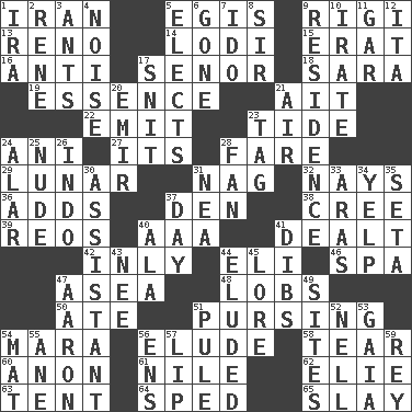ACROSS 1. SW Asia republic 5. The front part of a cuirass 9. Swiss mountan, "Queen of the Mountains" 13. Western Nevada city 14. Farming town in central California 15. Part of Q.E.F. 16. Against 17. Sir (Sp.) 18. "Two Mules for Sister ____" 19. Gist 21. Small island 22. Send forth 23. Periodic rise and fall of the sea level 24. Cuckoo 27. It is 28. Conductor's collection 29. Type of eclipse 31. Tired old horse 32. Negative votes 36. Does sums 37. Lair 38. Algonquian 39. Vintage cars 40. Auto club (abbr.) 41. Started a card game 42. Inwardly 44. Biblical high priest 46. Health resort 47. At sea 48. Tennis shots 50. Had dinner 51. Puckering 54. Hindu Mythology: god of death 56. Evade 58. Pull into pieces 60. At once, immediately (arch.) 61. Mediterranean tributary 62. Writer Wiesel 63. Portable shelter 64. Broke a traffic law 65. Kill DOWN 1. Retirement account (abbr.) 2. French philosopher Descartes 3. Pismires 4. Annoying sound 5. Opts 6. Went 7. Wedding promise 8. Title for a knight 9. Home 10. Feeling or showing extreme anger 11. Slender fish 12. Call ___ day 17. In a ____ (agitated or irritated) 20. Arab leader 21. Wind 23. Label 24. Having or resembling wings 25. Unadorned 26. Southeast Asian peninsula 28. Air blower 30. Helper 31. Teachers' org. 33. Ancient river in northeast Turkey 34. Sharp bark 35. Bristle 37. 24 hours 40. Insect wing 41. Claim 43. Born 44. Dodged 45. Old wives' tales, e.g. 47. Composer Copland 49. Locates 51. Whimper 52. 1994 drama film starring Jodie Foster 53. Greek goddess of the earth (variant) 54. Floor covering 55. A saturated hydrocarbon 56. Followers of ems 57. Mouth edge 59. Marina Del _, California